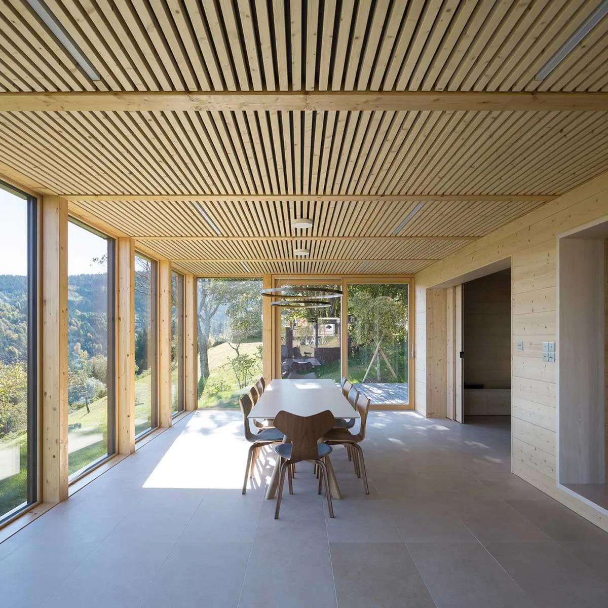 The strategic placement of wooden elements, from the flooring to the ceiling, ensures that nature is always within reach, blurring the lines between the indoors and the outdoors.