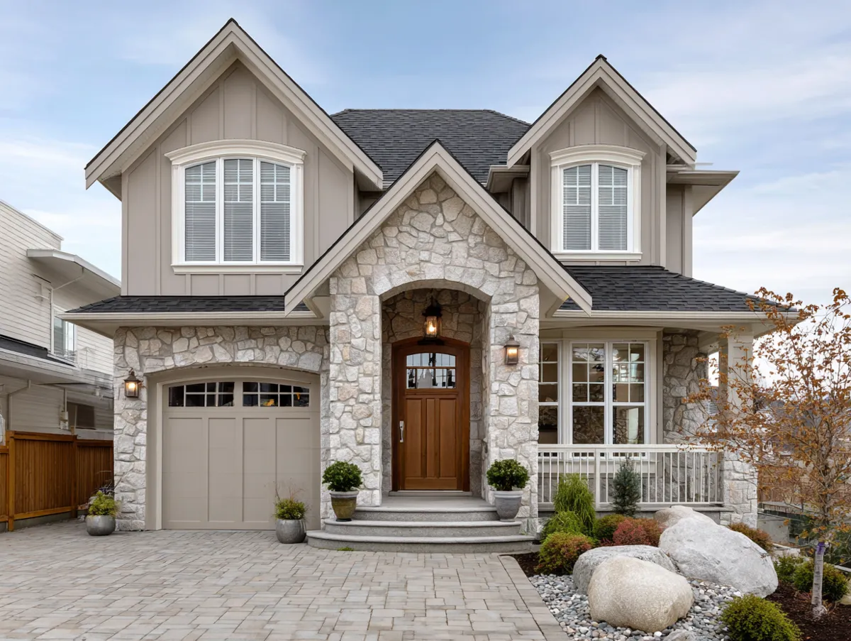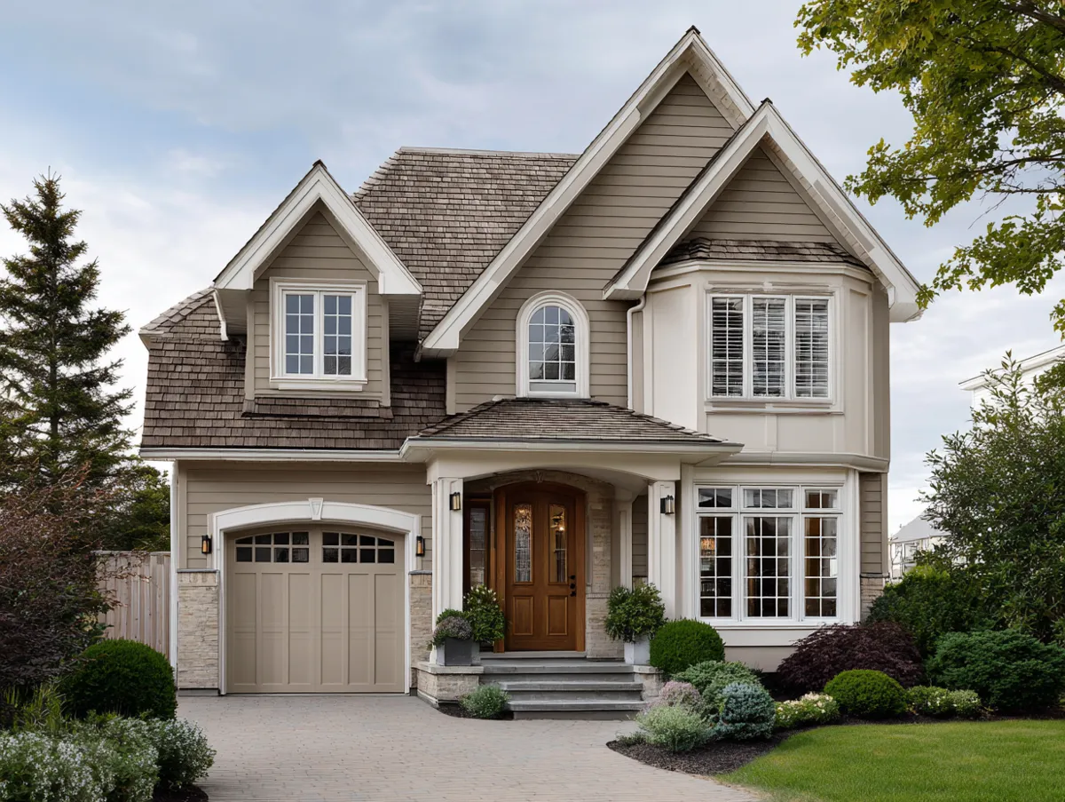 To prevent warm neutrals like beige or tan from looking flat, incorporate a variety of textures and accent colors. Pair neutral siding with natural materials like stone or dark wood to add depth, or use a bold, high-contrast color like navy blue or forest green for the front door and shutters. Additionally, choosing a monochromatic palette—where you use varying shades of the same neutral for the main body, trim, and accents—creates a sophisticated and harmonious look that feels intentionally designed rather than just simple.