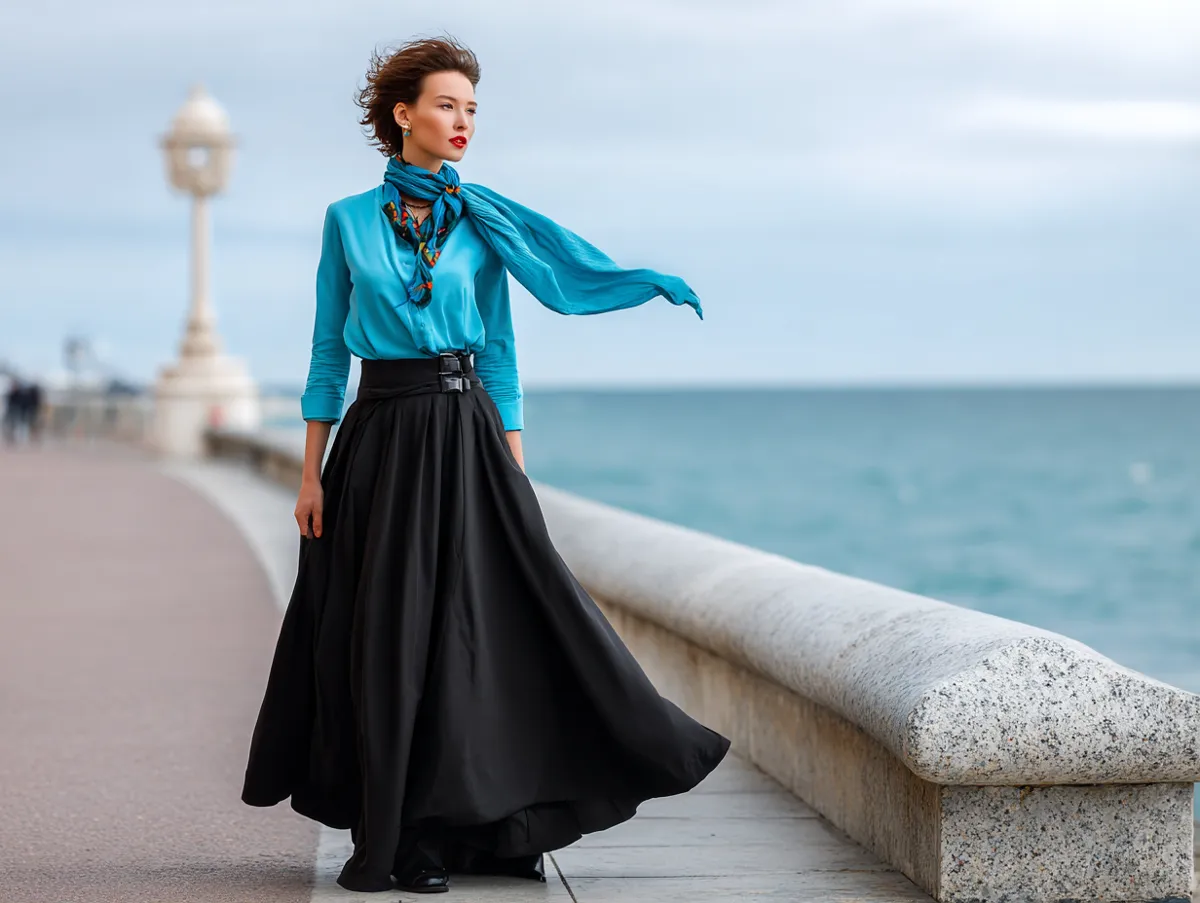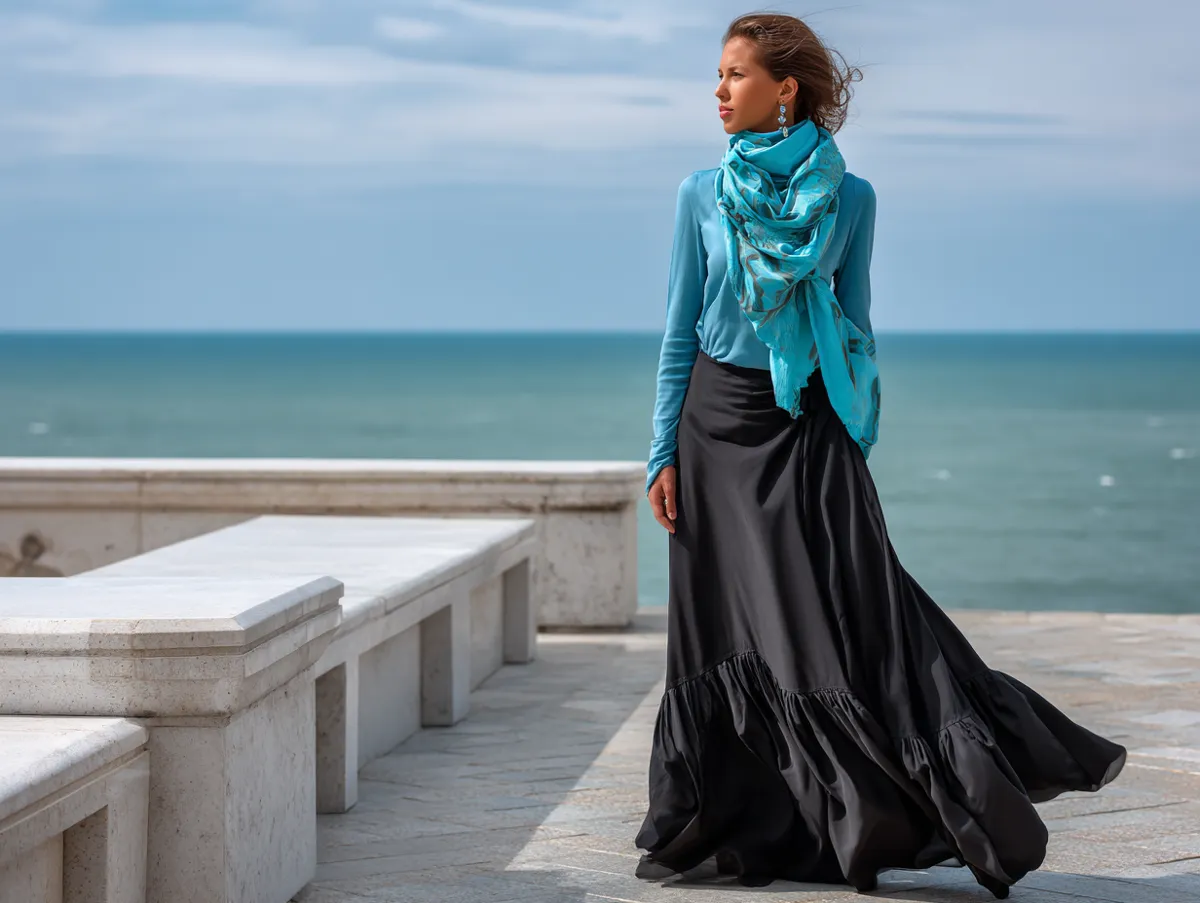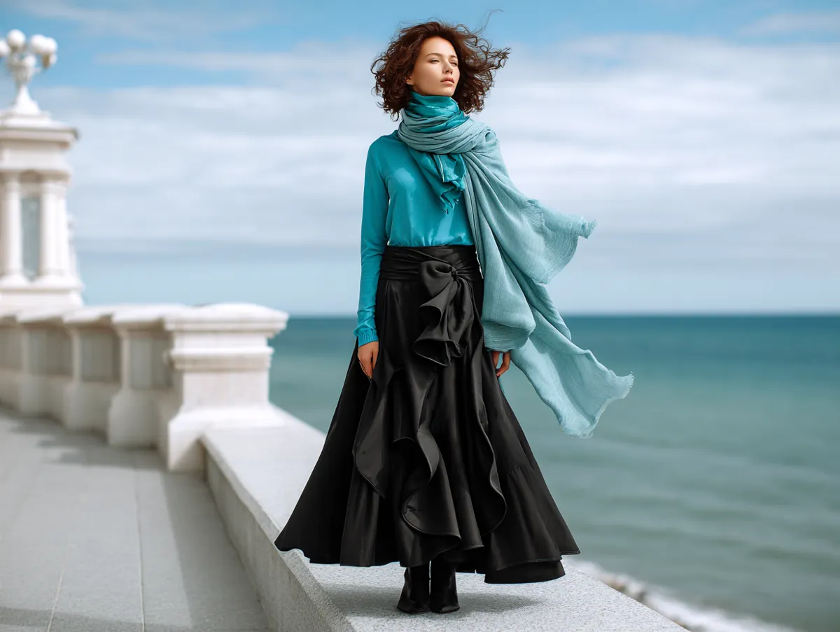 Ultimately, this colour story celebrates balance. The long black skirt anchors your presence, while turquoise evokes emotion and openness. Together they represent confidence with composure—an elegant duality perfect for city walks, seaside escapes, or creative workspaces. Wearing such an ensemble feels like carrying a pocket of summer wherever you go.