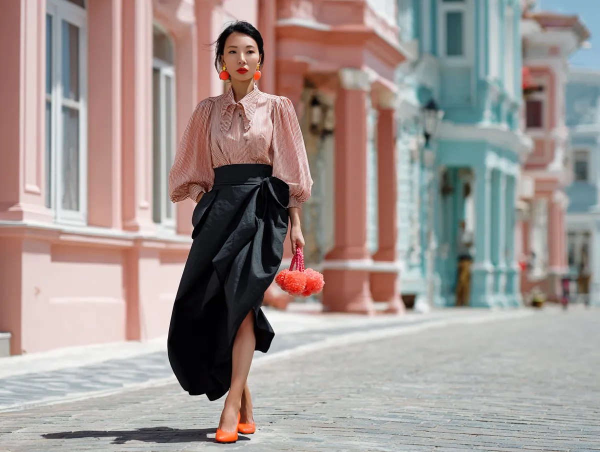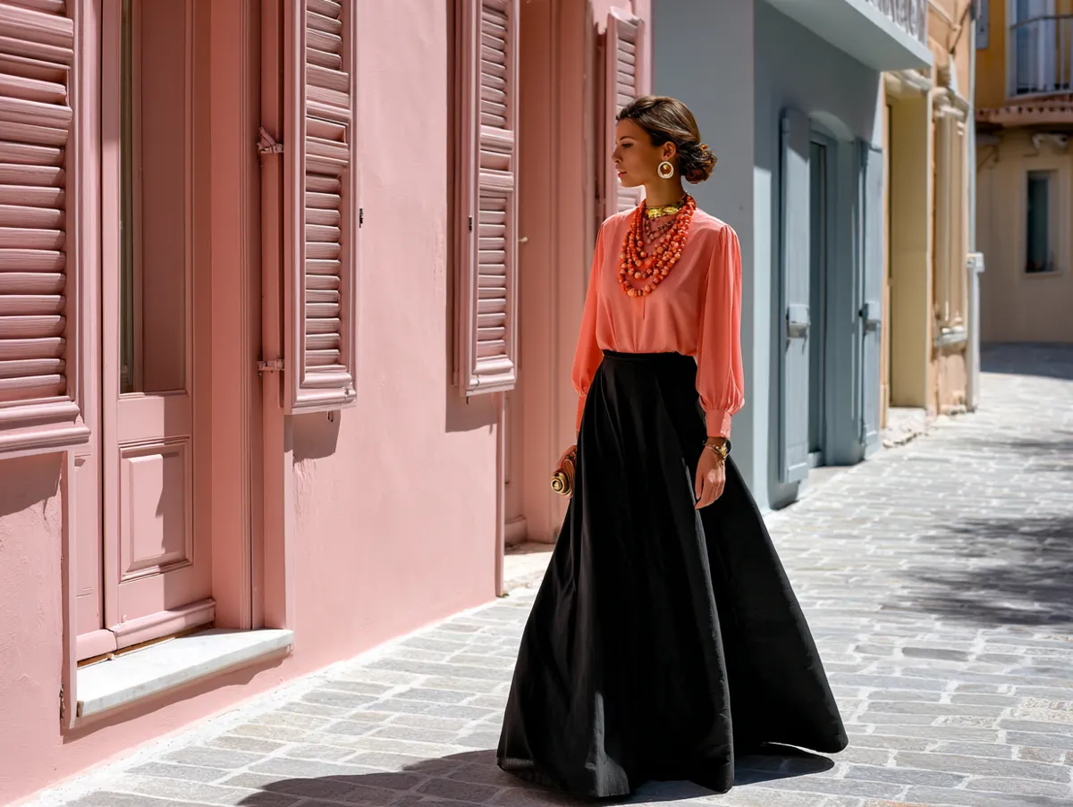 The next step is choosing a neutral companion for balance. White, cream, or soft beige tops make ideal partners for a long black skirt. They allow coral to stand out naturally without competing for attention. Imagine a flowing white blouse tucked into a high-waisted skirt, finished with coral heels or sandals. This combination feels relaxed yet intentional—perfect for brunch, art gallery strolls, or even an evening date.