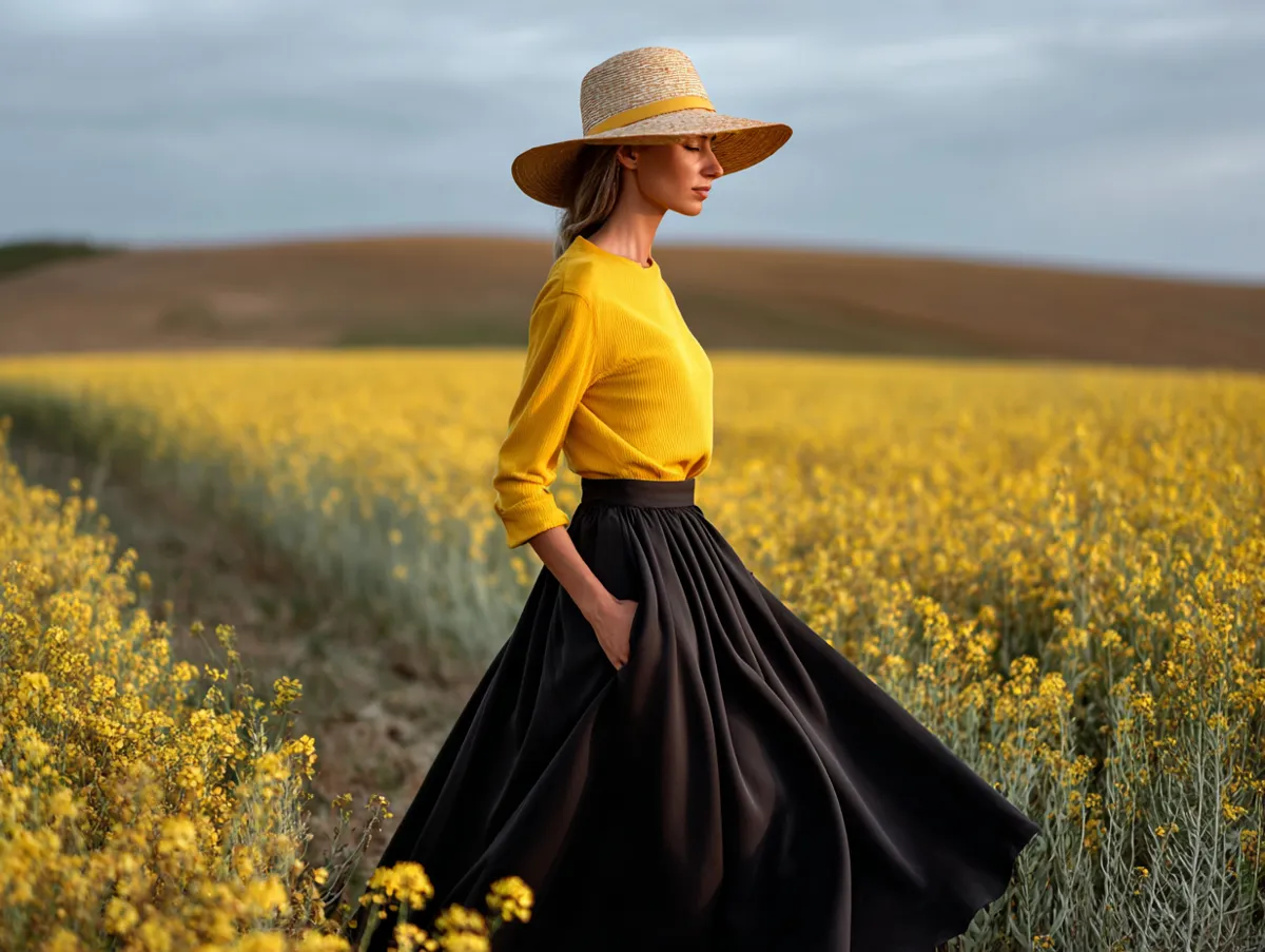 Such long black skirt outfit ideas celebrate joy through simplicity. They remind us that elegance doesn’t depend on restraint alone but on confidence in contrast. The balance of yellow’s vitality and black’s calm authority makes every step feel deliberate. When sunlight hits the fabric and colour, the outfit almost seems to glow—a wearable expression of energy and grace.
