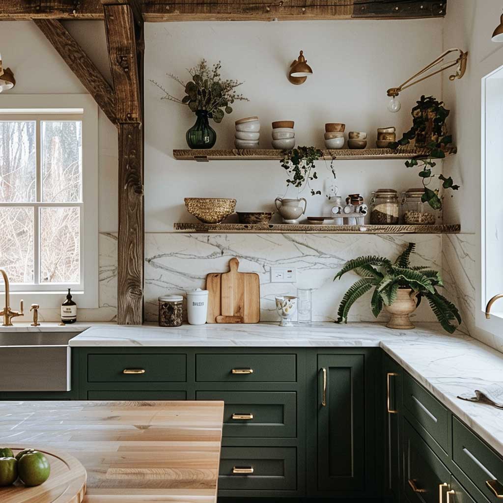 Envision a kitchen where dark green cabinets are the stars of the show. This bold color choice brings a depth and elegance to the space, setting a backdrop that is both striking and comforting. The dark green cabinets provide a lush contrast against the backdrop of white walls and marble countertops, creating a dynamic interplay of colors that is both eye-catching and harmonious. The choice of dark green not only adds visual interest but also evokes a connection to nature, making the kitchen feel like a serene retreat.