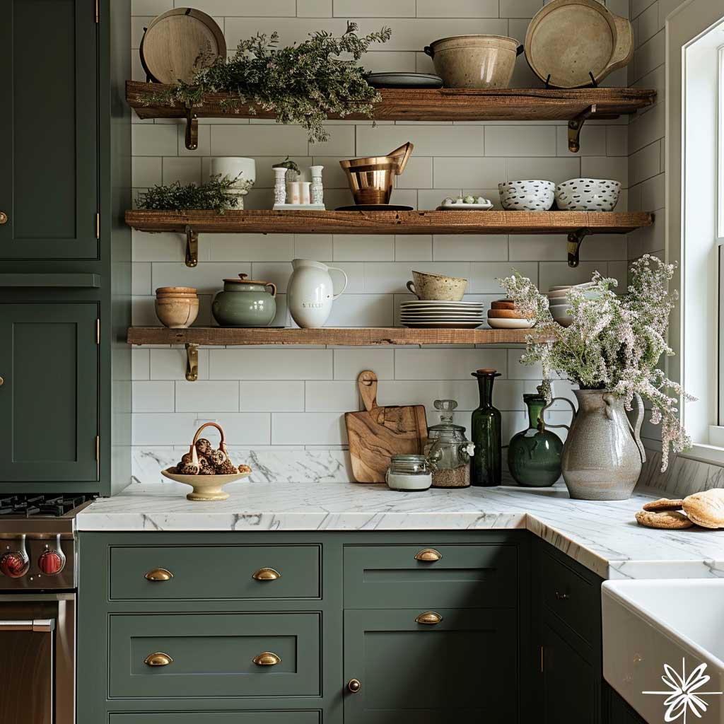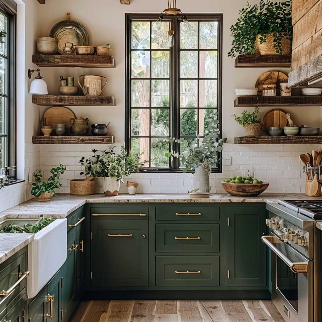 The beauty of incorporating dark green into the kitchen lies in its versatility. Whether the overall design leans towards classic, modern, or rustic, dark green can adapt, offering a timeless appeal that enhances the kitchen’s aesthetic. In this cozy corner, the cabinets’ dark green hue is complemented by brass fixtures, which add a touch of warmth and luxury. The metallic sheen of the brass against the matte finish of the dark green creates a sophisticated contrast that elevates the entire design.