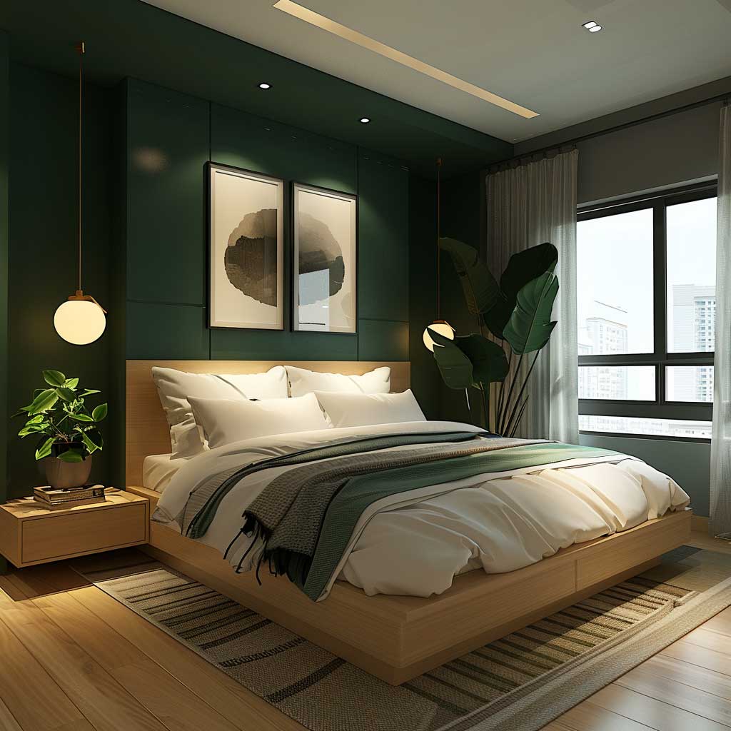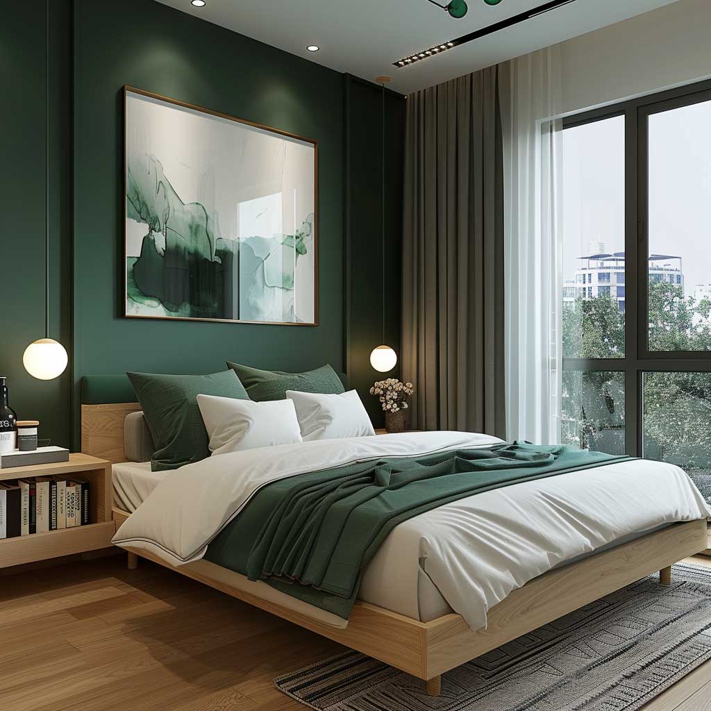 The bedroom, a personal sanctuary for rest and rejuvenation, becomes the ideal canvas for this blend of style and color. A dark green accent wall becomes the focal point of the room, drawing the eye with its boldness while serving as a backdrop for the minimalist decor. This choice of color for the wall adds a layer of depth to the room, creating a sense of calm and luxury that enhances the minimalist design rather than overwhelming it.