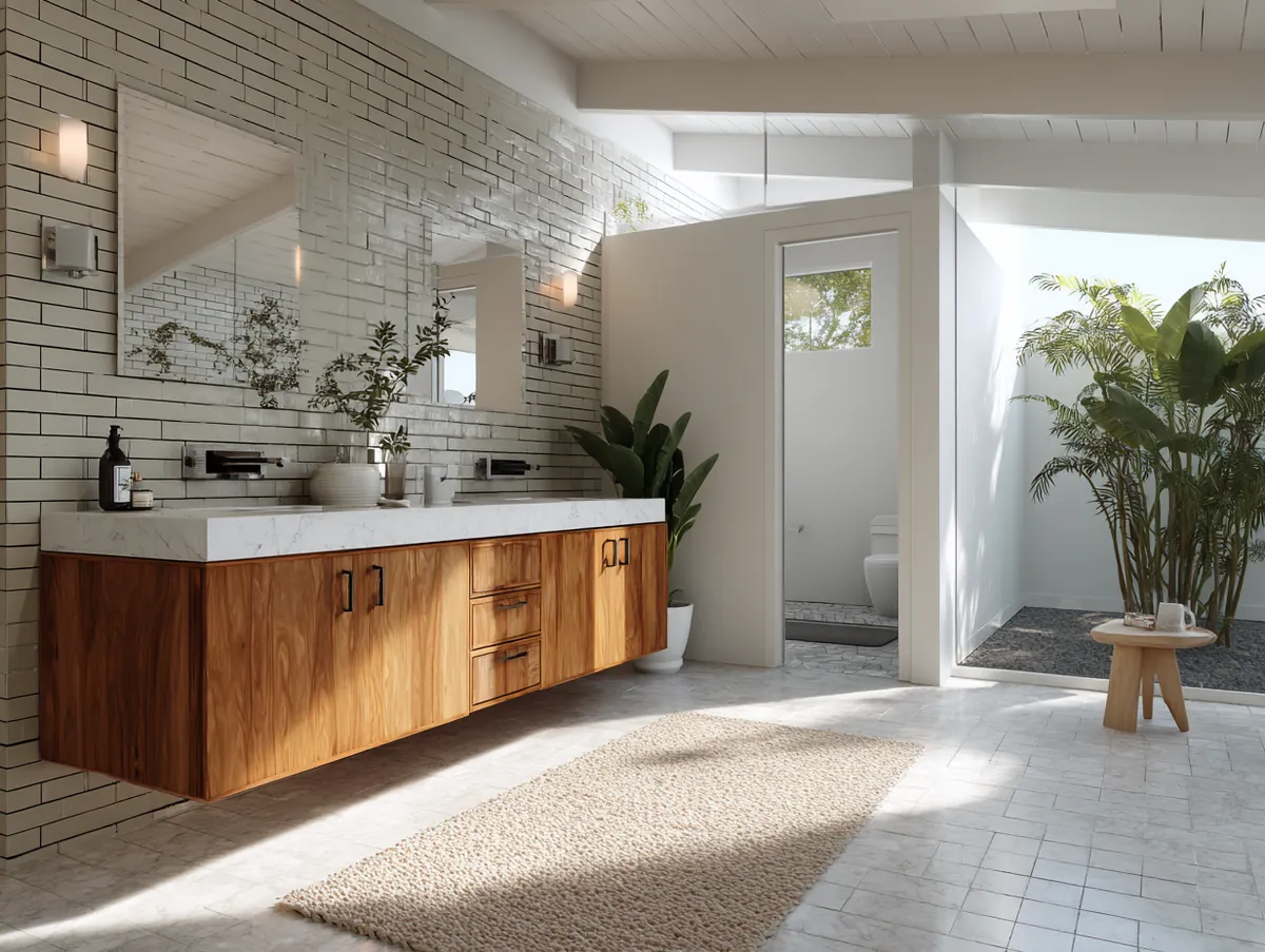 Floating vanities are a great way to create a midcentury modern bathroom that is both stylish and functional. These vanities are mounted to the wall and appear to float, creating a sleek, minimalist look that is characteristic of midcentury modern design.