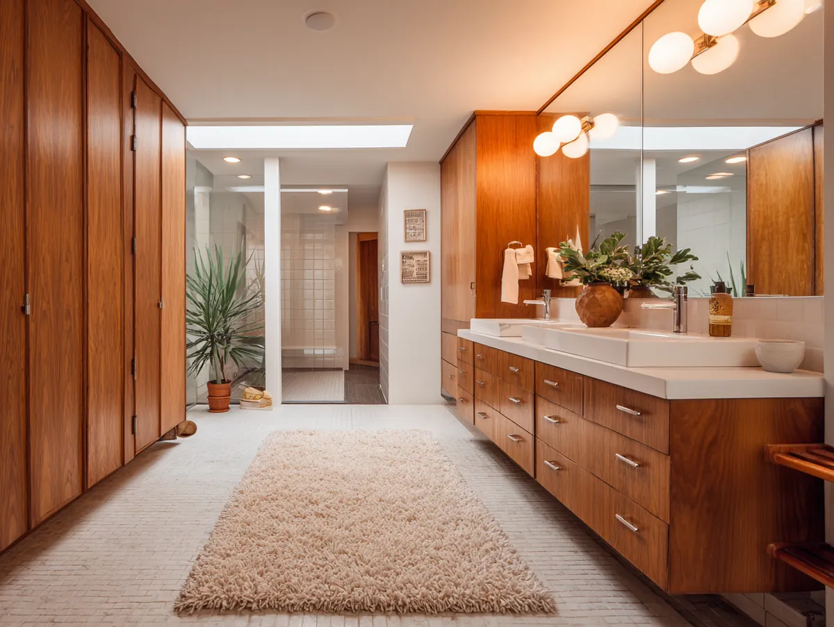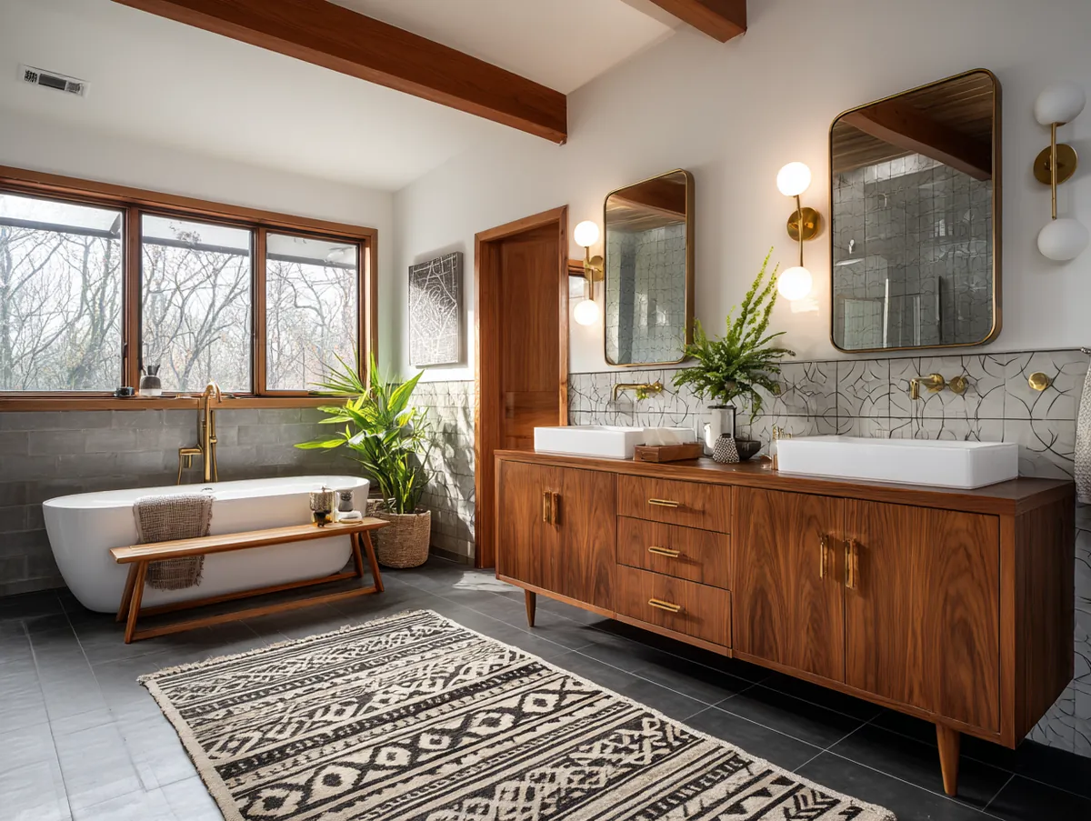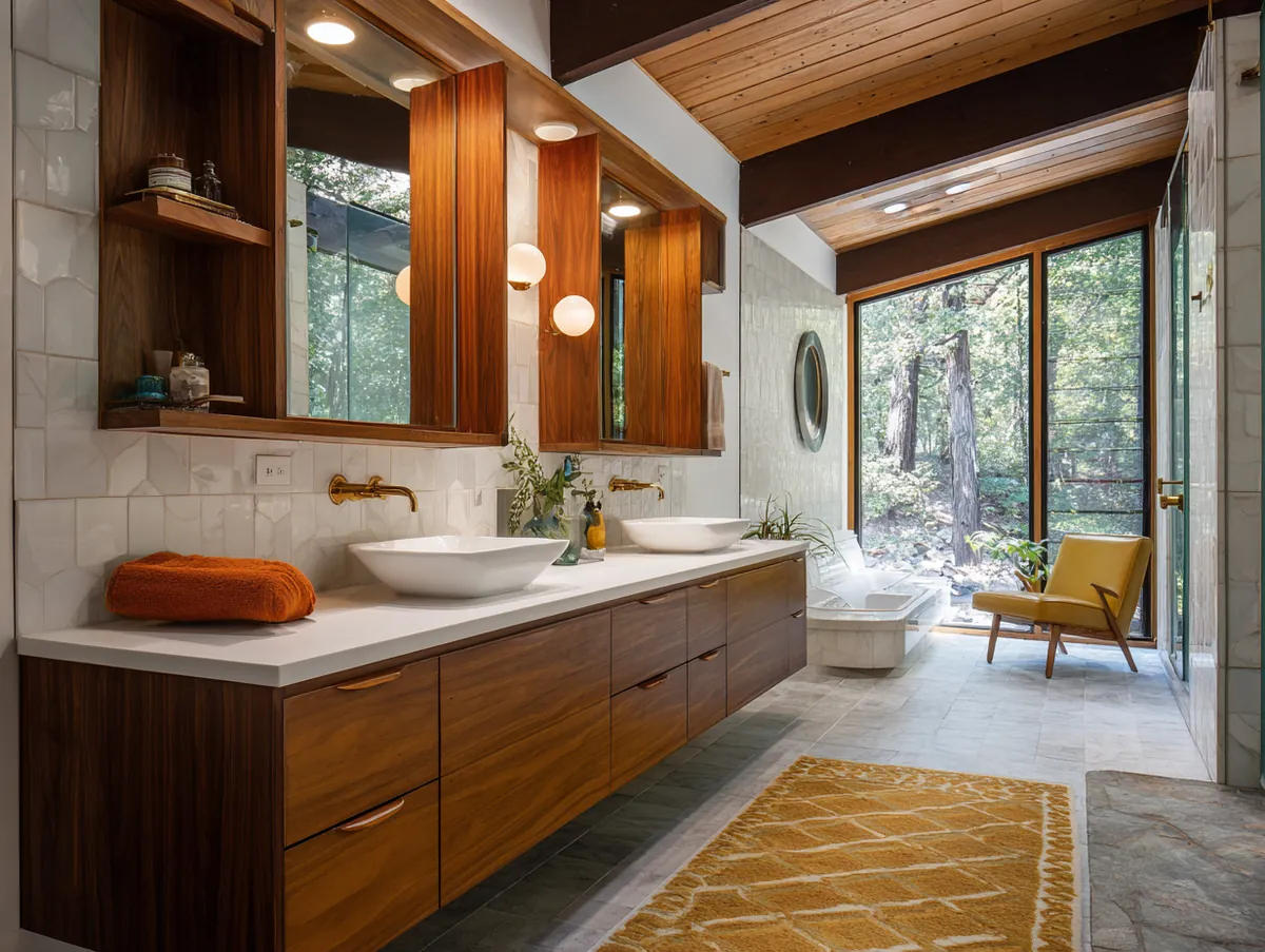 Midcentury modern design is all about bringing the outdoors in. To achieve this look in your bathroom, consider using natural materials like wood and stone. A wooden vanity or a stone countertop will add warmth and texture to your space, while also creating a connection to nature.
