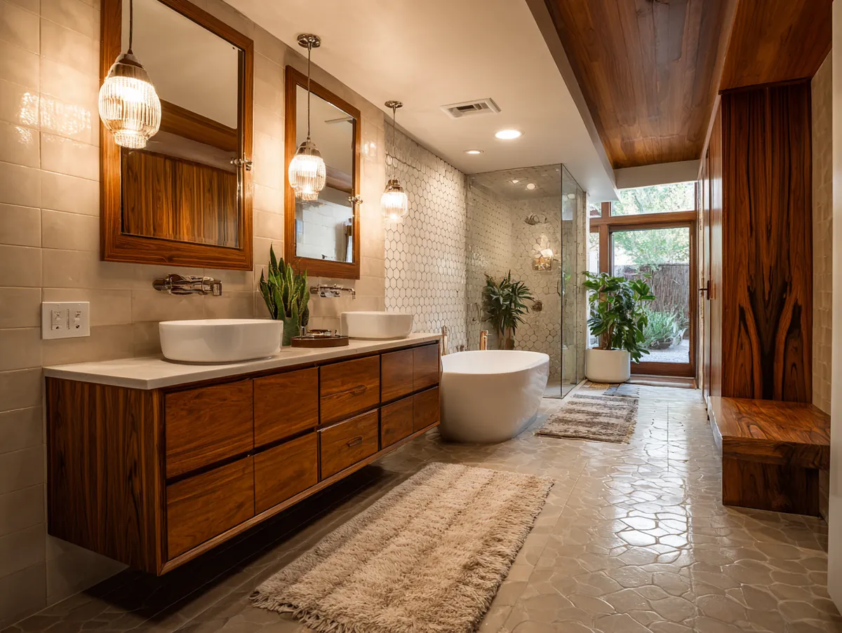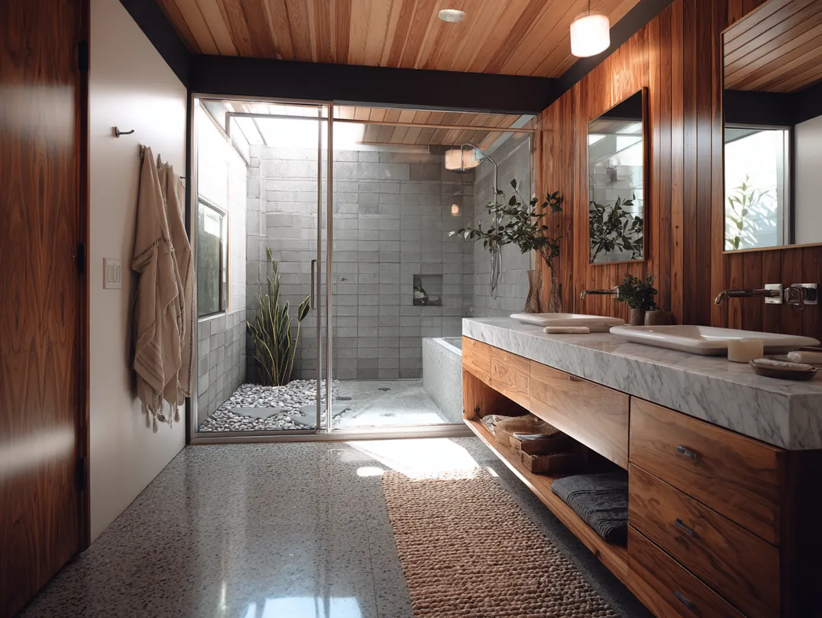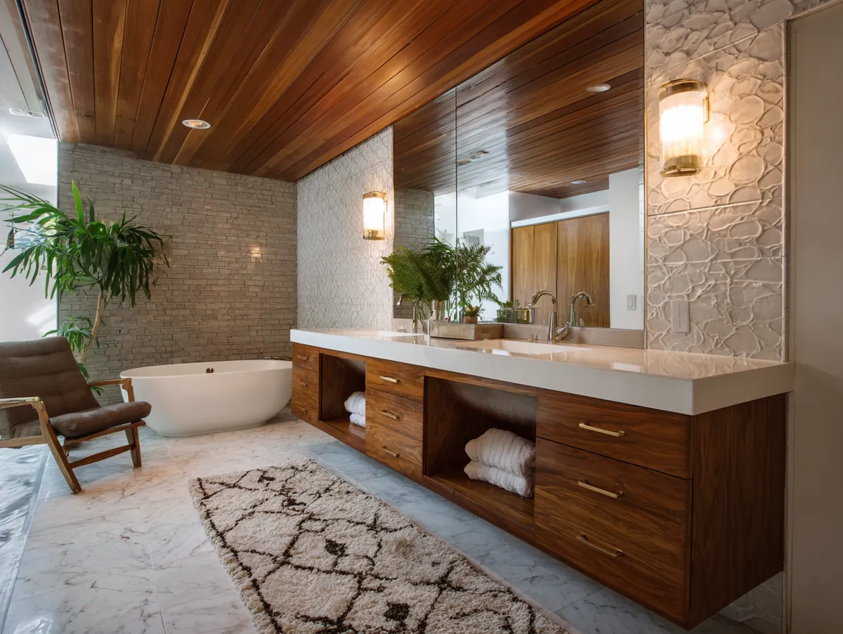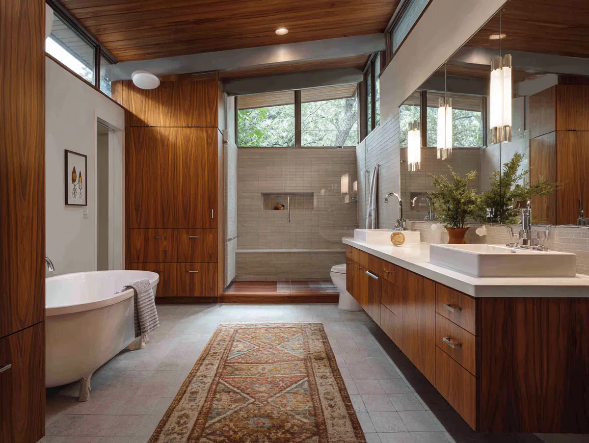 Midcentury modern design is all about bringing the outdoors in. To achieve this look in your bathroom, consider using natural materials like wood and stone. A wooden vanity or a stone countertop will add warmth and texture to your space, while also creating a connection to nature.