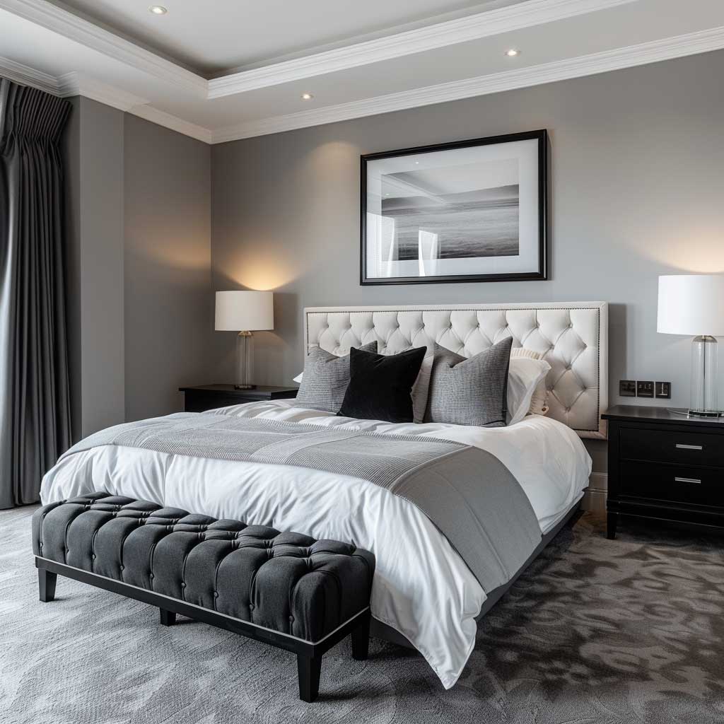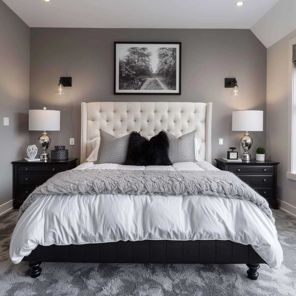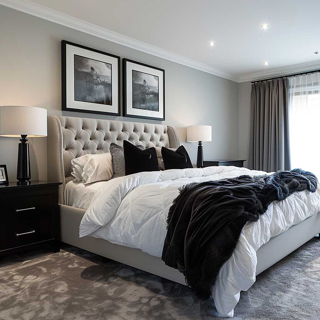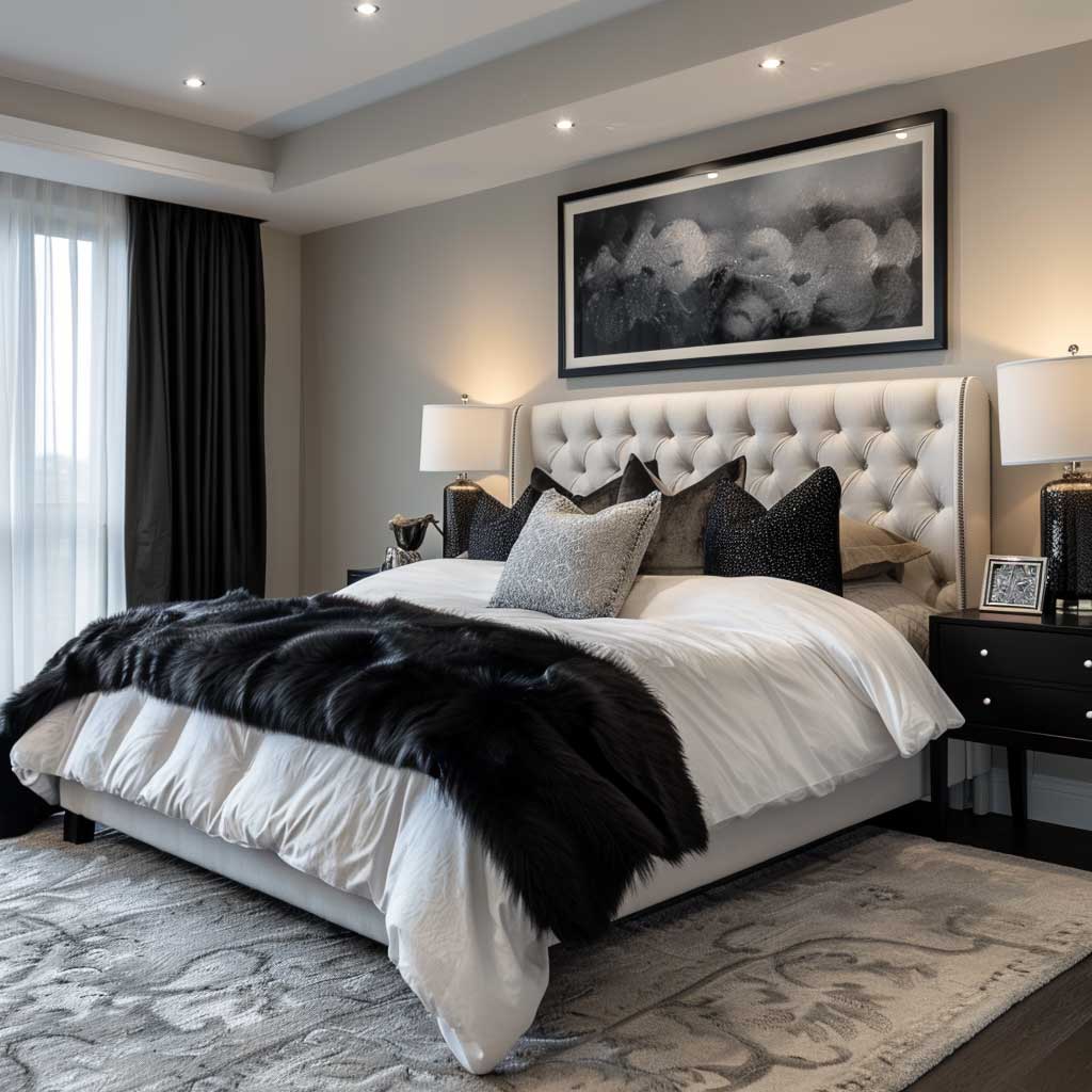 Visual interest is maintained through the addition of a large black and white photograph above the bed. This piece serves as a focal point, drawing the eye and tying the room’s decor together. Such artwork not only enhances the monochrome theme but also introduces a personal element, allowing the inhabitants to express their tastes and preferences within the design.
