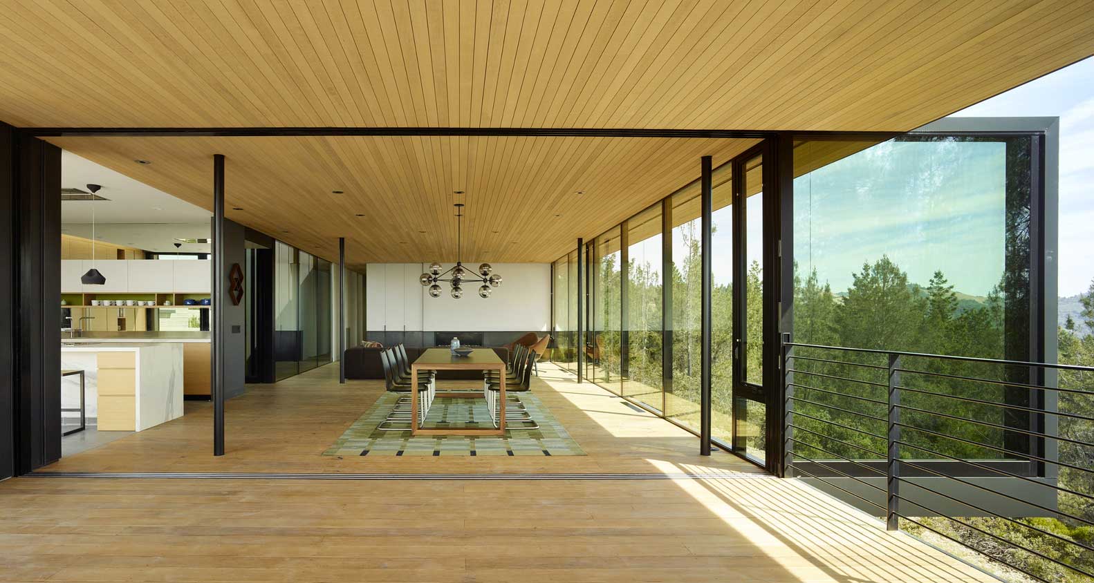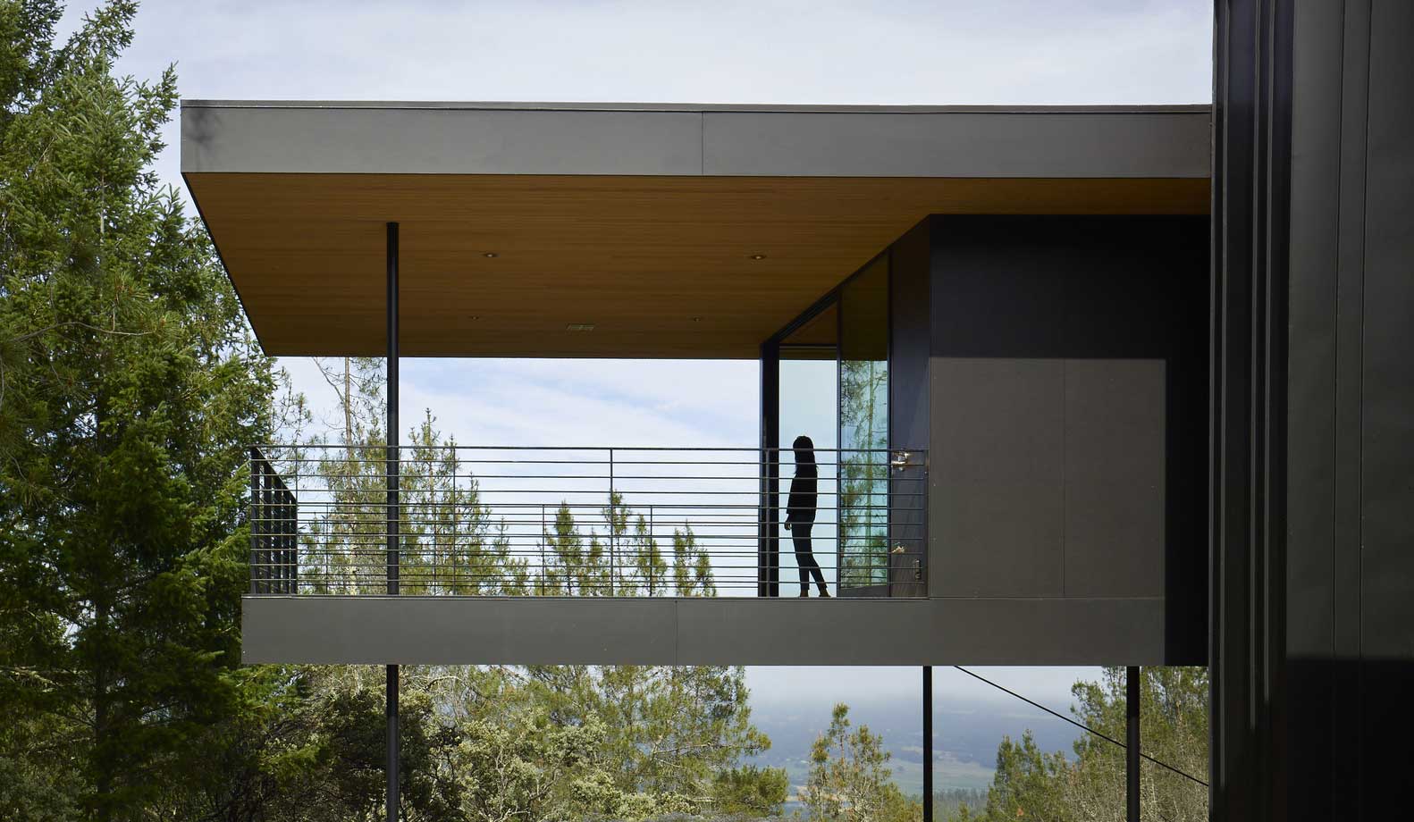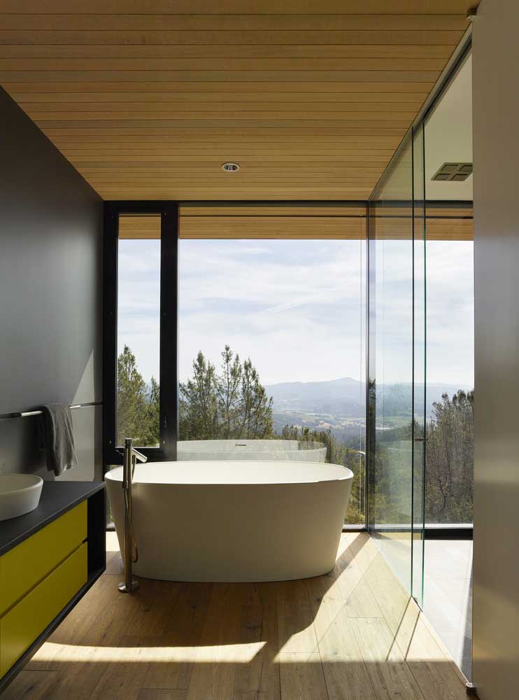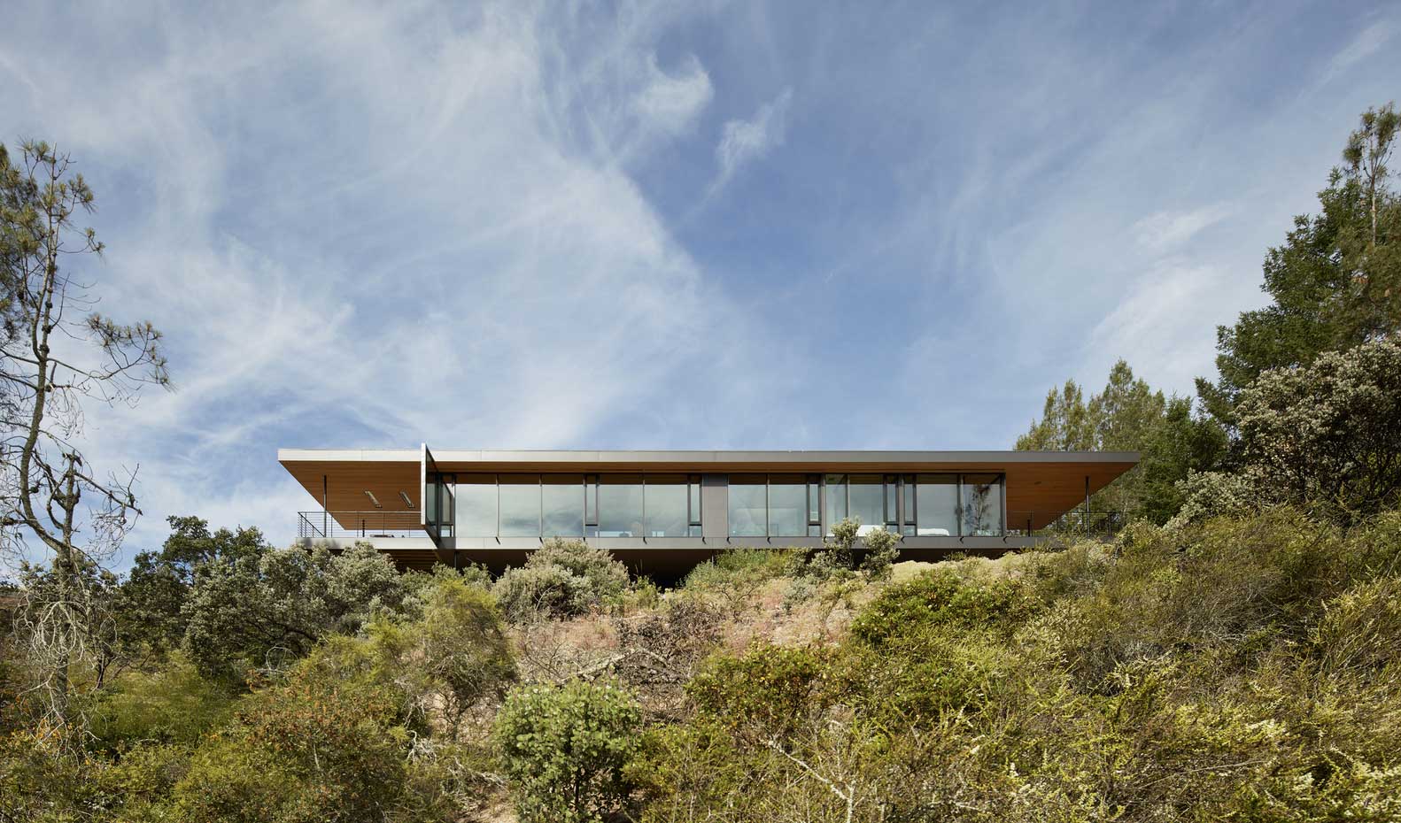A beautiful ultra-modern cottage on a Californian slope with panoramic views of the Sonoma Valley rises as a symbol of success, luxury and prosperity. The minimalist glass construction blends in effectively with the natural environment and opens up a new format for owners to contact the landscape. Incredibly tightly integrated into nature, a modern house on slope gives a feeling of freedom, comfort in the midst of dense vegetation.