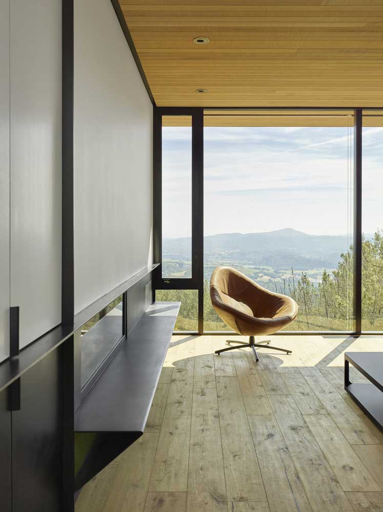 Private areas, bedrooms also did not become too local. From here open the same beautiful, majestic views of the forest, mountains, valley, as well as from the kitchen-living room. The external structures of the rooms are completely glass, which guarantees even more interaction with the outside world. The color scheme of the interior is neutral, so as not to draw attention to yourself and not to distract from the breathtaking panorama.