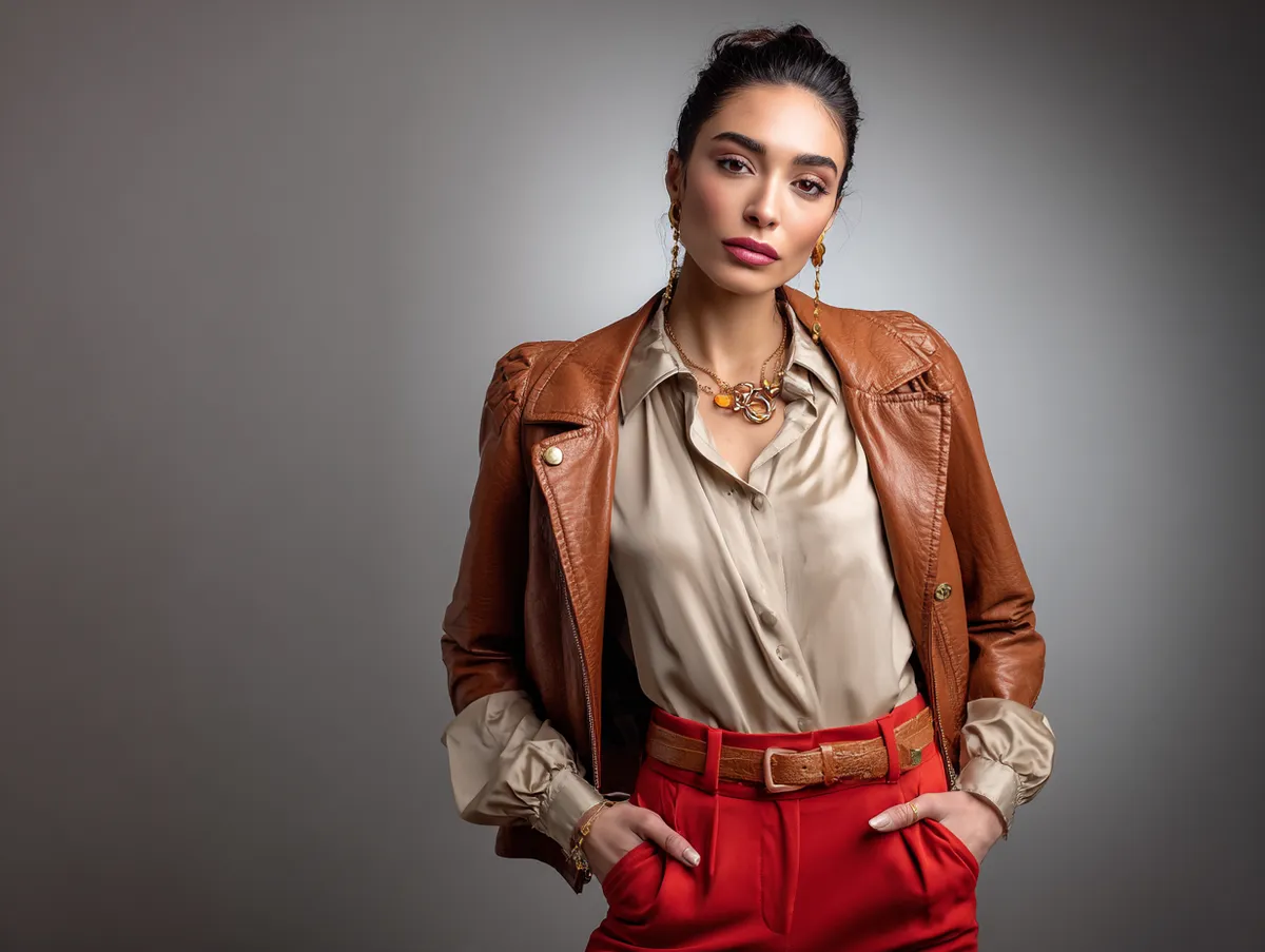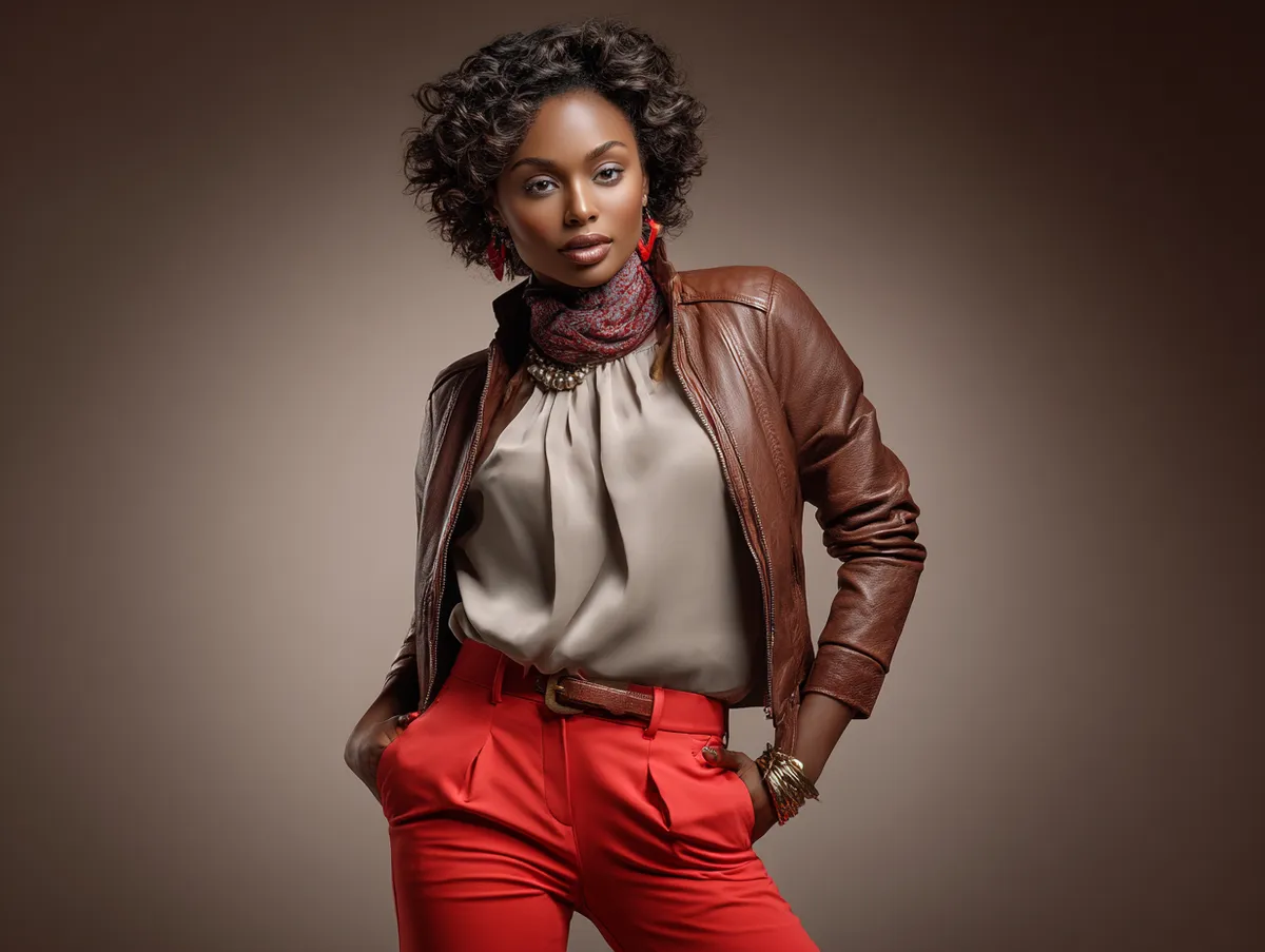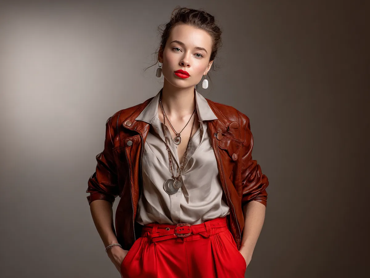 Start with foundation pieces: tailored red trousers or a pencil skirt create structure, while a cream or taupe blouse softens the look. Introducing brown leather through a jacket, belt, or boots ties the elements together. These red outfit ideas achieve a perfect blend of texture and tone, giving the ensemble timeless appeal.