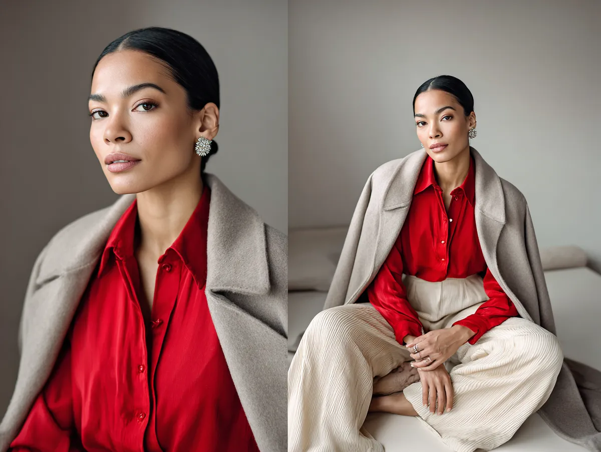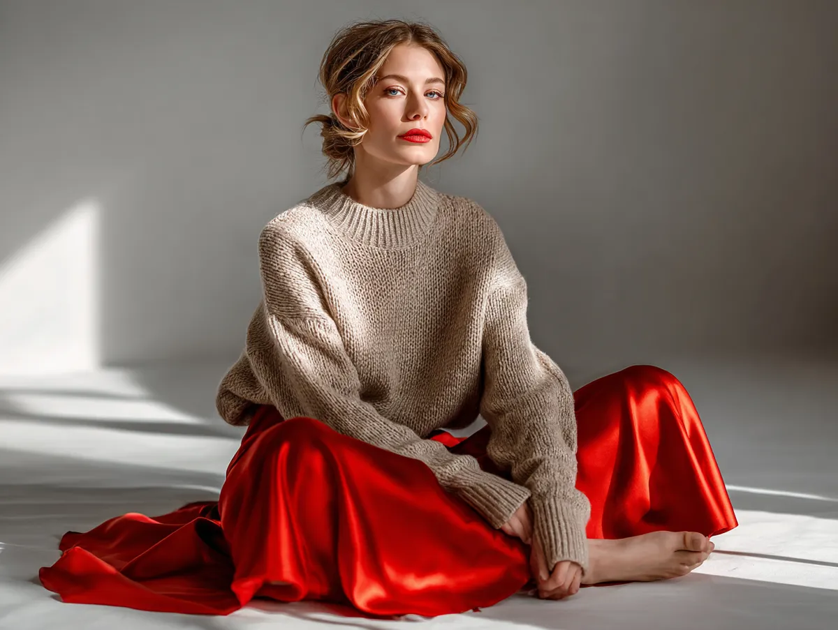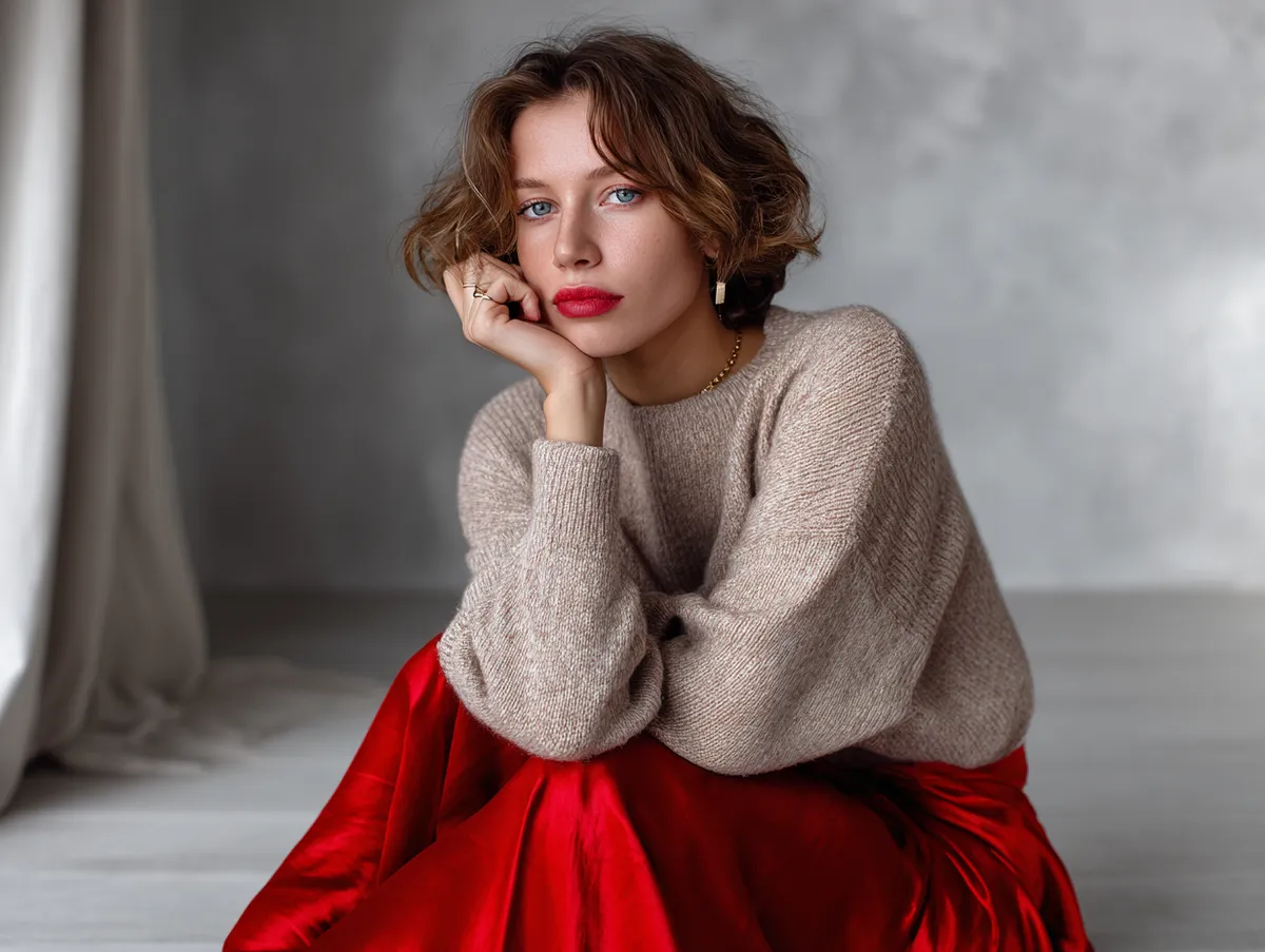 In studio portrait fashion, this pairing captures both warmth and confidence. Soft lighting brings out the gentle glow of beige while emphasizing the movement and richness of red. These red outfit ideas work particularly well for women who love understated elegance. The interplay of tones makes the overall look feel cozy yet poised — the kind of outfit that transitions easily from day meetings to evening coffee.