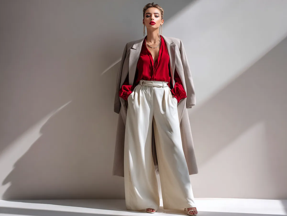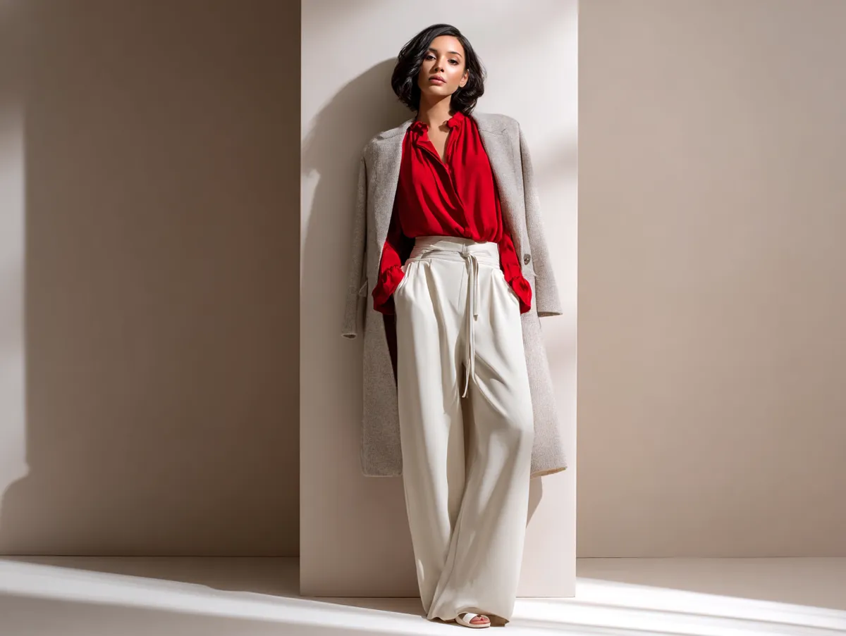 The foundation of these red outfit ideas begins with smart layering. A silk red blouse provides vibrancy, while cream trousers elongate the silhouette. Topping it off with a taupe coat introduces quiet contrast and texture. This approach to dressing speaks to balance — an interplay of light and warmth that feels sophisticated and modern.