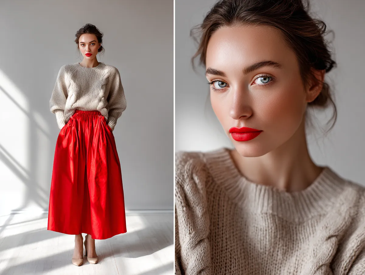 Pairing red with beige may seem like a classic choice, but the real magic lies in texture and proportion. Among the most effortless red outfit ideas with earth tones, the combination of a beige sweater and a red skirt creates balance that’s chic, warm, and modern. The neutral knit brings softness, while the vivid hue introduces energy — a harmony that works beautifully in both casual and semi-formal settings.