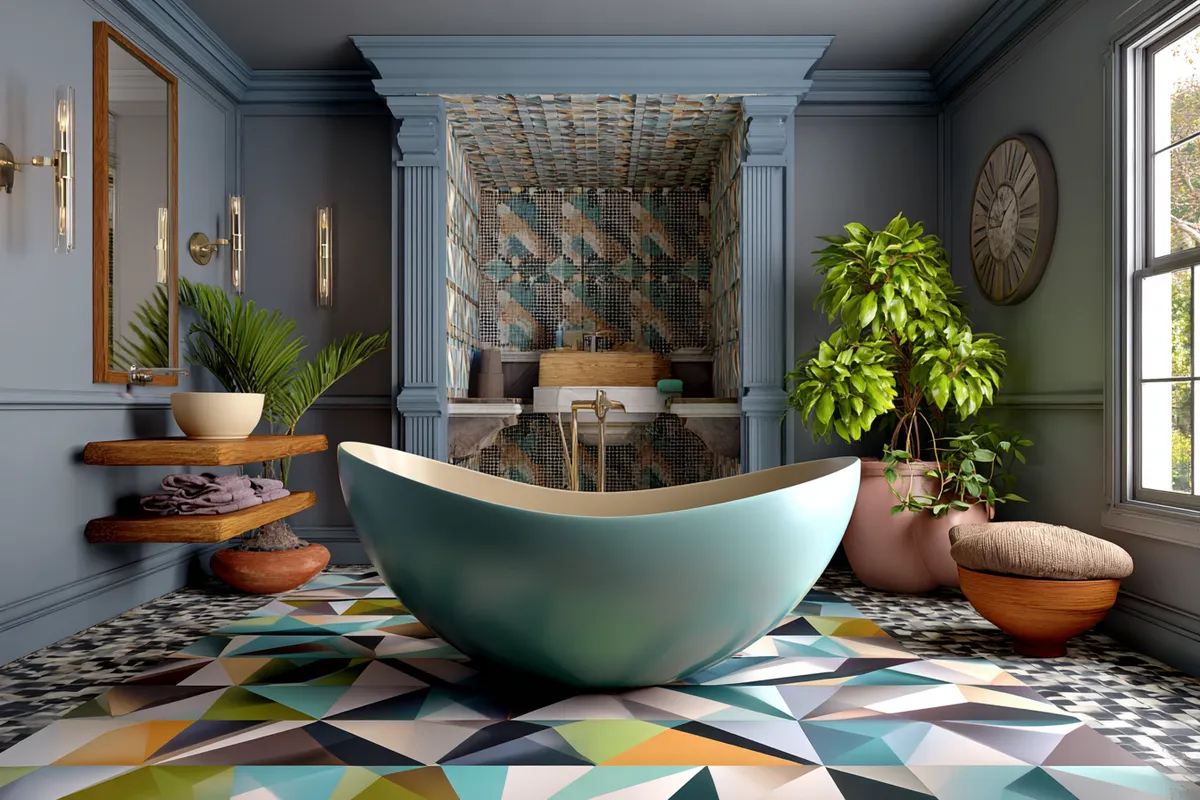The image offers a captivating glimpse of a bathroom that has been artfully transformed through geometric design. The highlight of the room is the floor, where tiles laid in a geometric pattern create a stunning visual impact. The tiles, in an assortment of cool blues and warm neutrals, lend depth and dimension to the space.