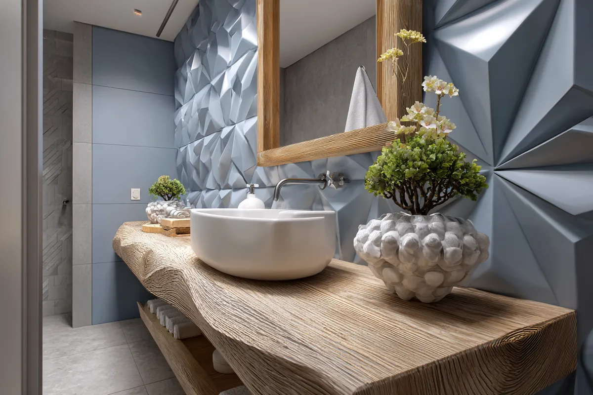 Lastly, strategically placed accessories like geometrically shaped vases and storage containers add the finishing touches to the room, reinforcing the geometric theme while providing practical storage solutions. The integration of geometric elements in this bathroom design has resulted in a space that is visually engaging, functional, and inviting.