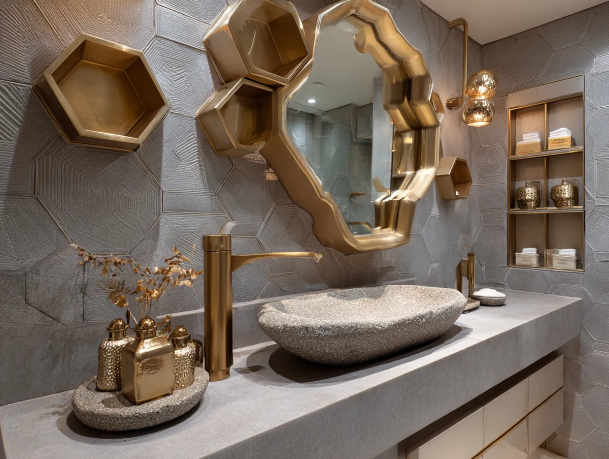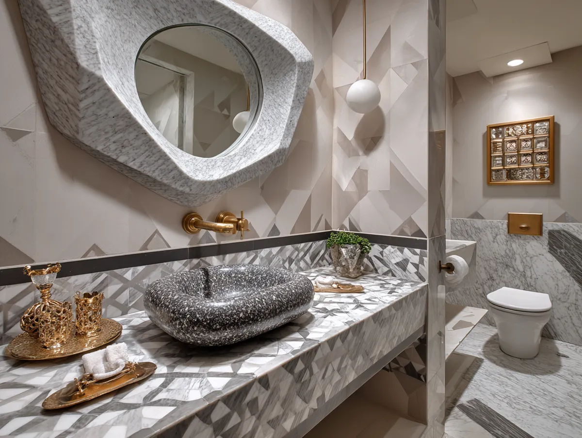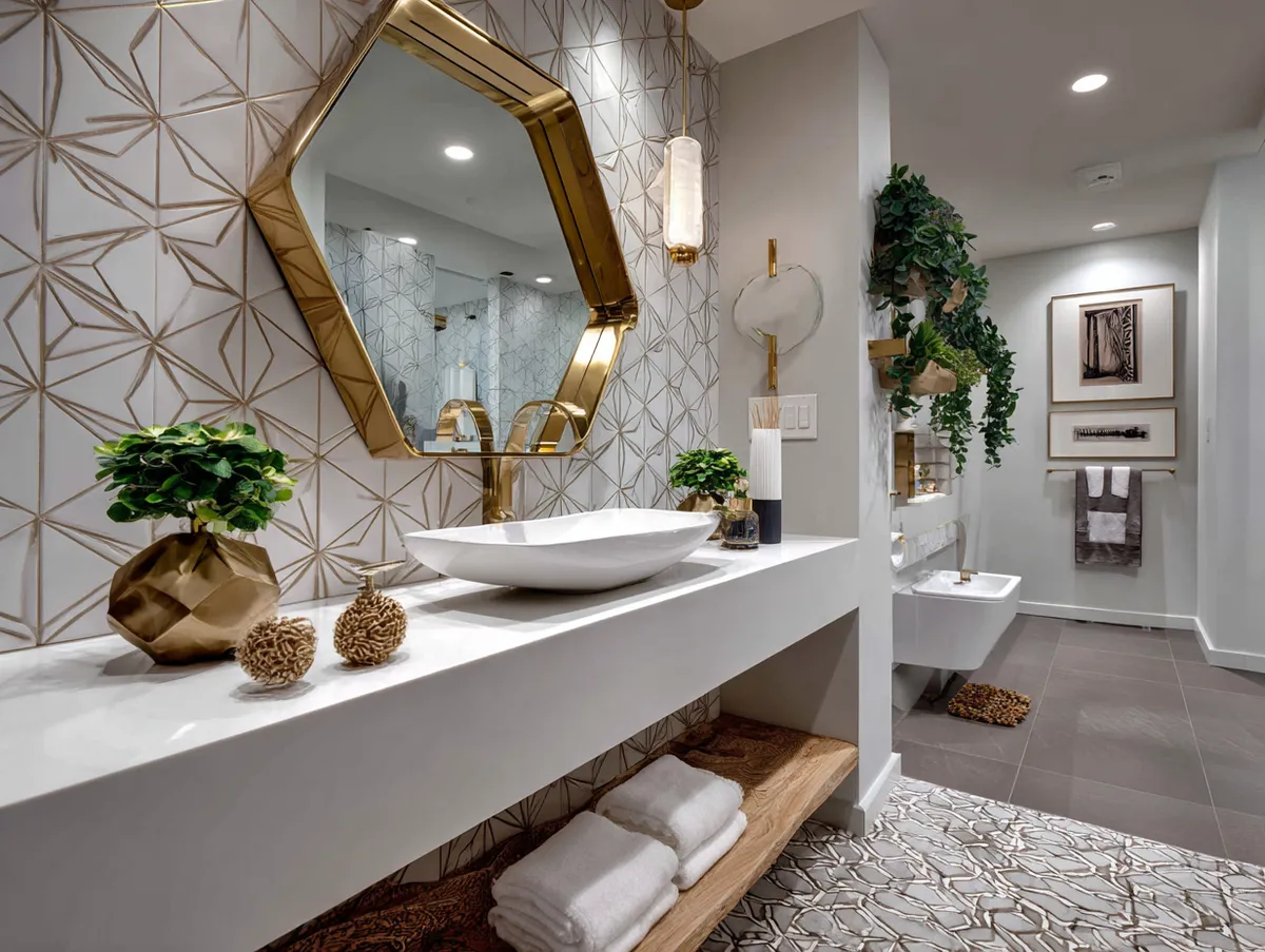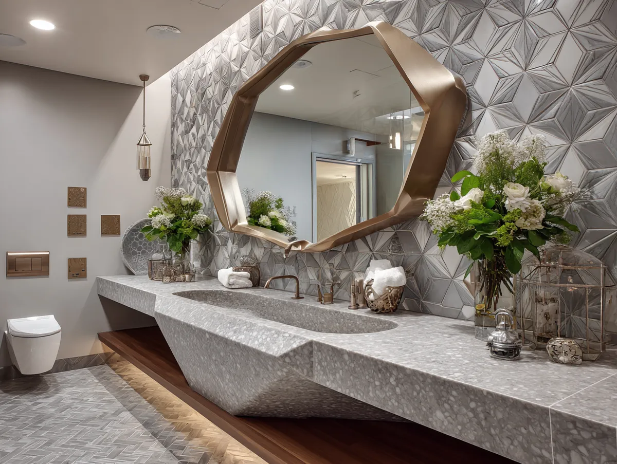 Immerse yourself in the exciting world of geometric design with our showcase of a geometric bathroom design. This image exemplifies the innovative application of geometric patterns and forms in bathroom interiors, resulting in a space that is both functional and visually appealing.