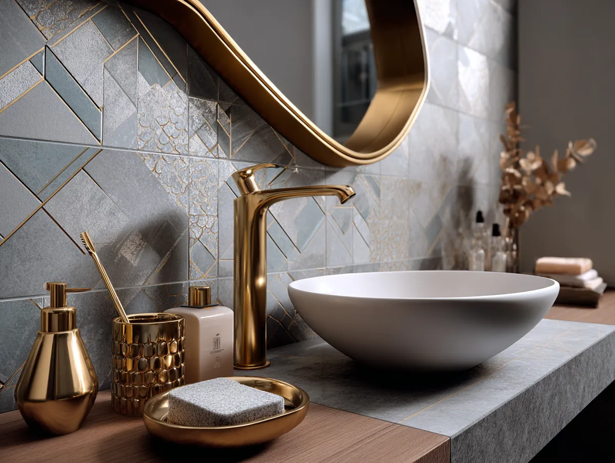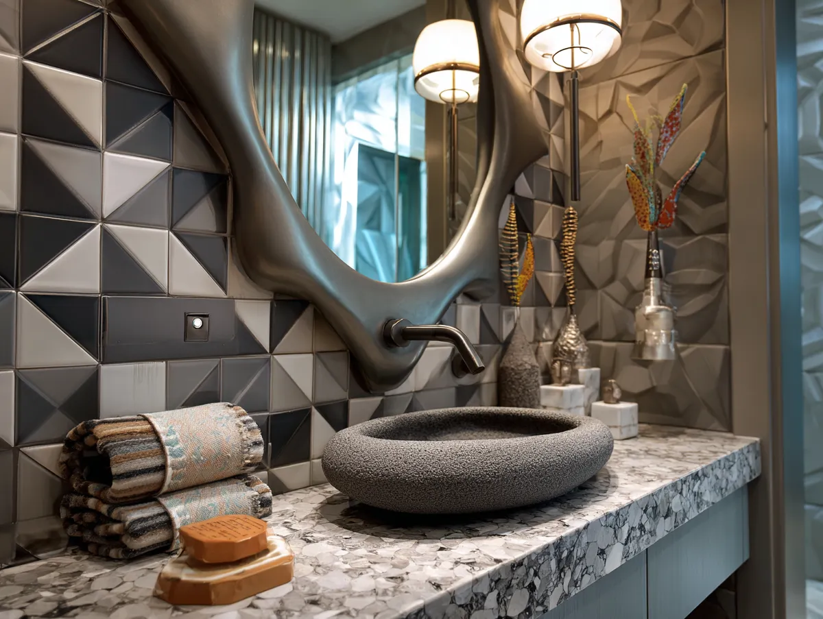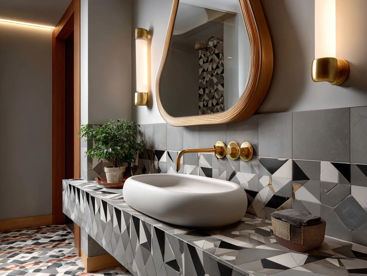 Centered against the tiled wall is a sleek, modern sink with clean lines that mirror the geometric theme. The sink, in a cool white color, provides a striking contrast to the vibrant tiles behind it. Above the sink, a mirror in a unique geometric shape reflects the room’s design elements, enhancing their visual impact.
