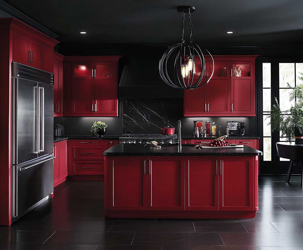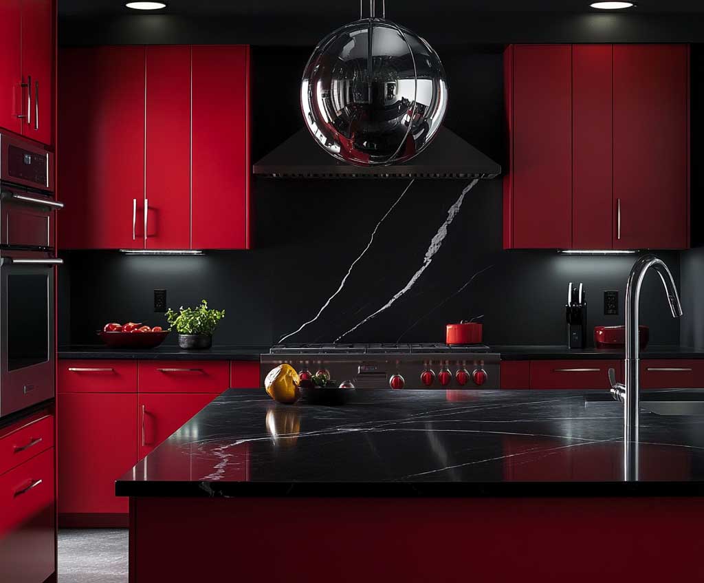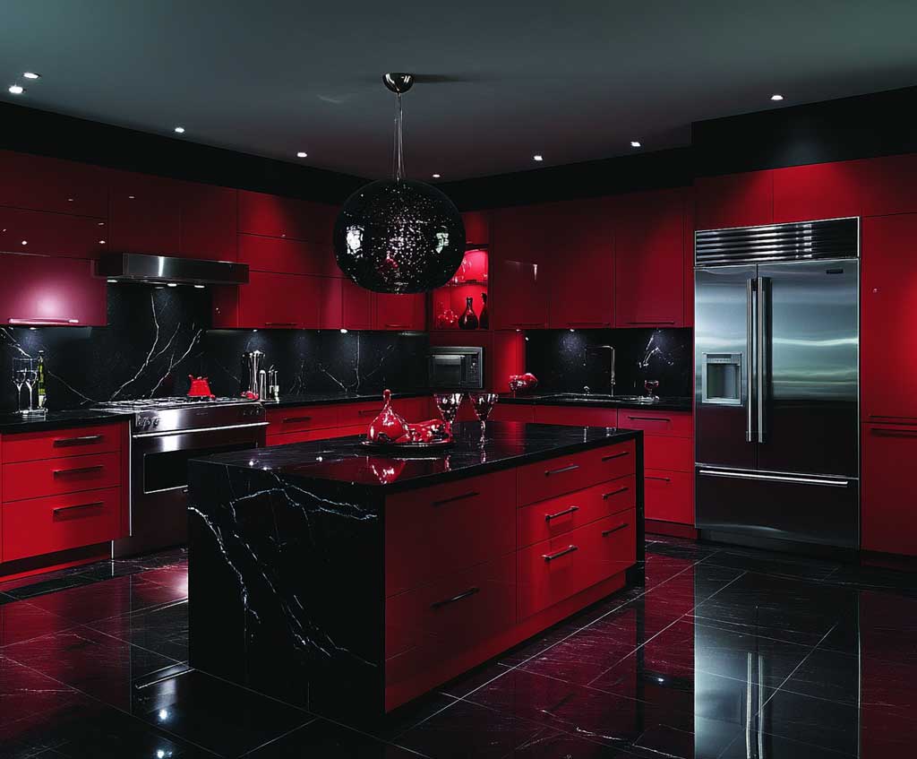 Midnight Black Kitchen with Scarlet Accents