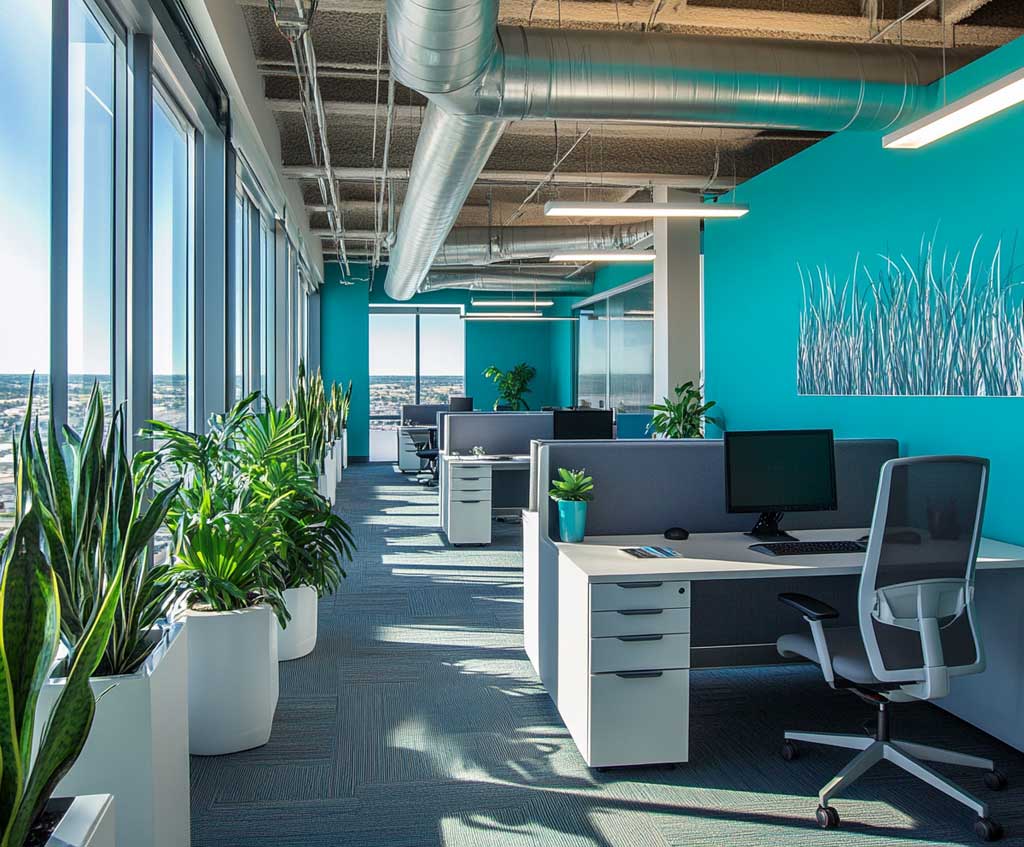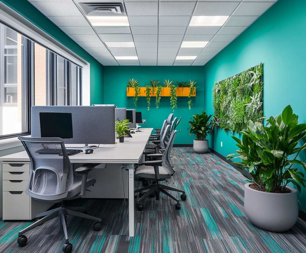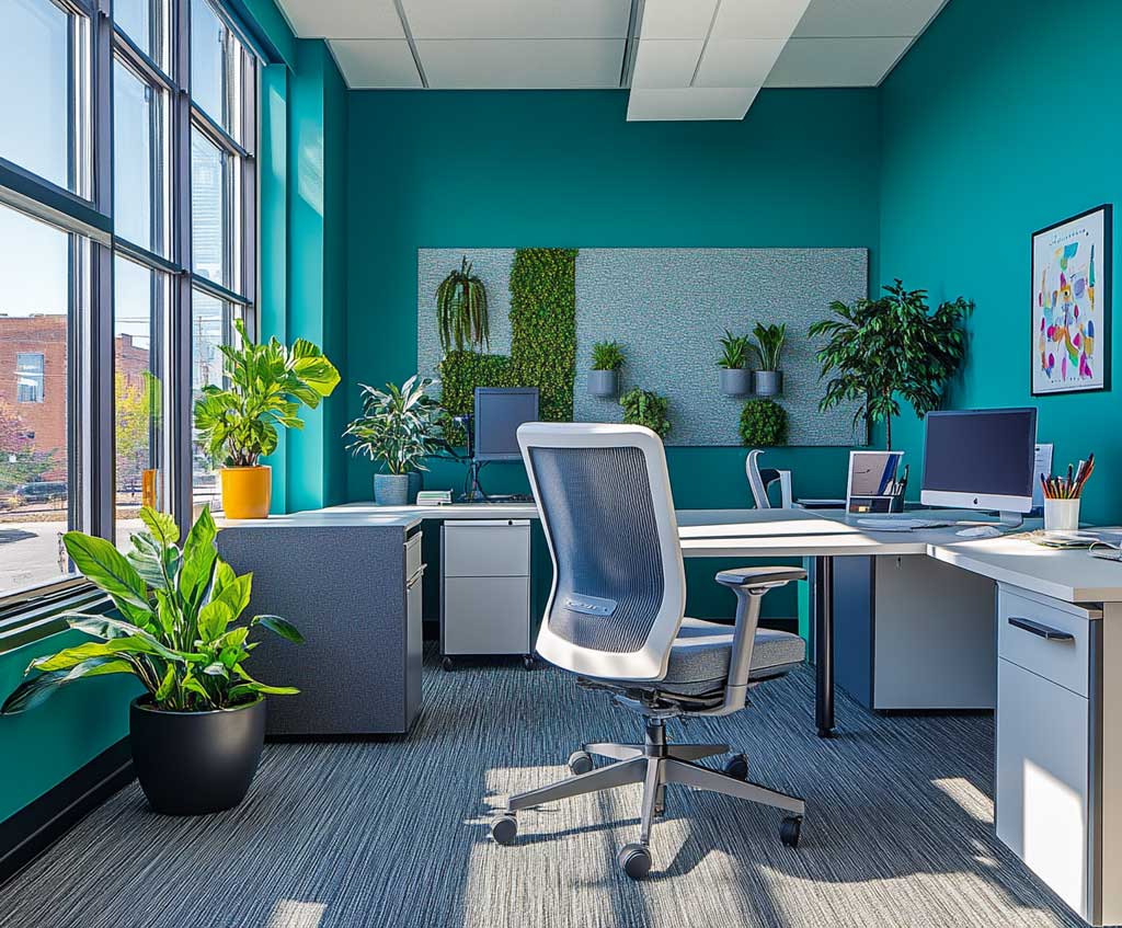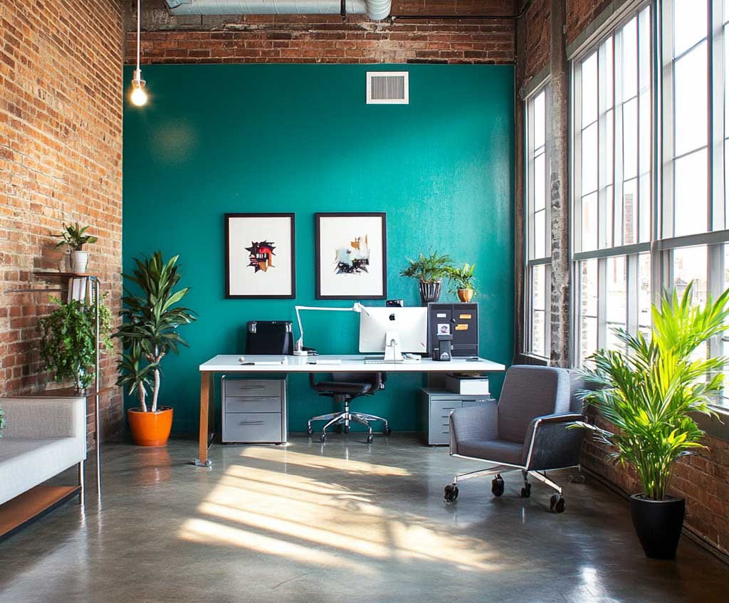 The use of modern, minimalist furniture in the workspace supports the bold teal and charcoal color scheme. This style of furniture, with its clean lines and restrained colors, allows the interior wall paint design to stand out, focusing all attention on the vibrant walls.