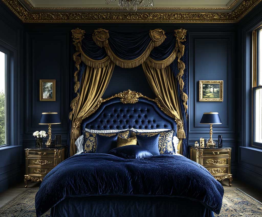 Deep Indigo Bedroom with Gold Highlights