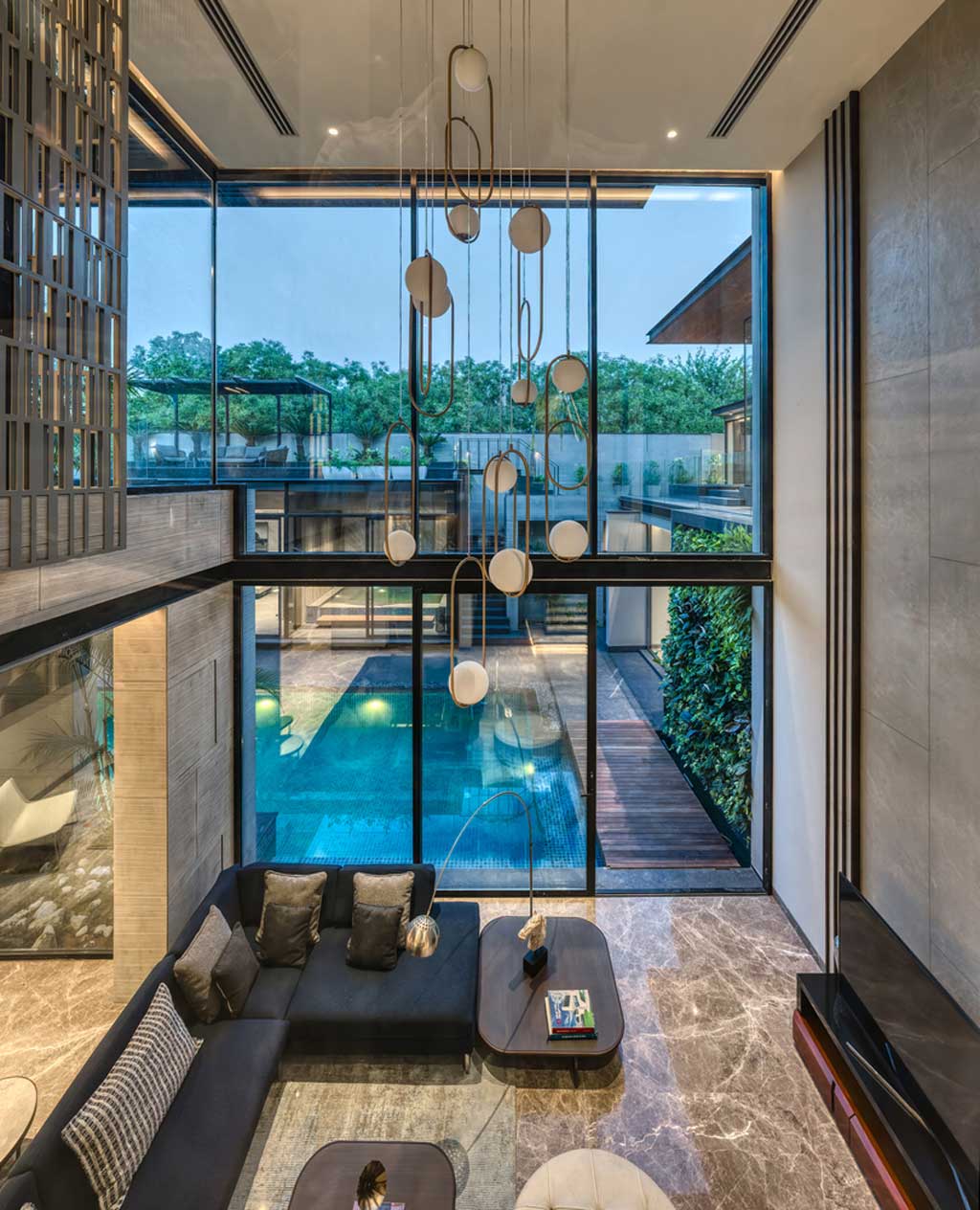 The presence of such large windows also elevates the sensory experience within the space. The gentle breeze that flows through them, the sounds of nature from outside, and the ever-changing dance of shadows across the room bring a sense of movement and life to the otherwise still space. With the pool just beyond the windows, the sparkling reflections of water further enhance the atmosphere, creating an ever-shifting interplay of light that adds a dynamic quality to the retreat.