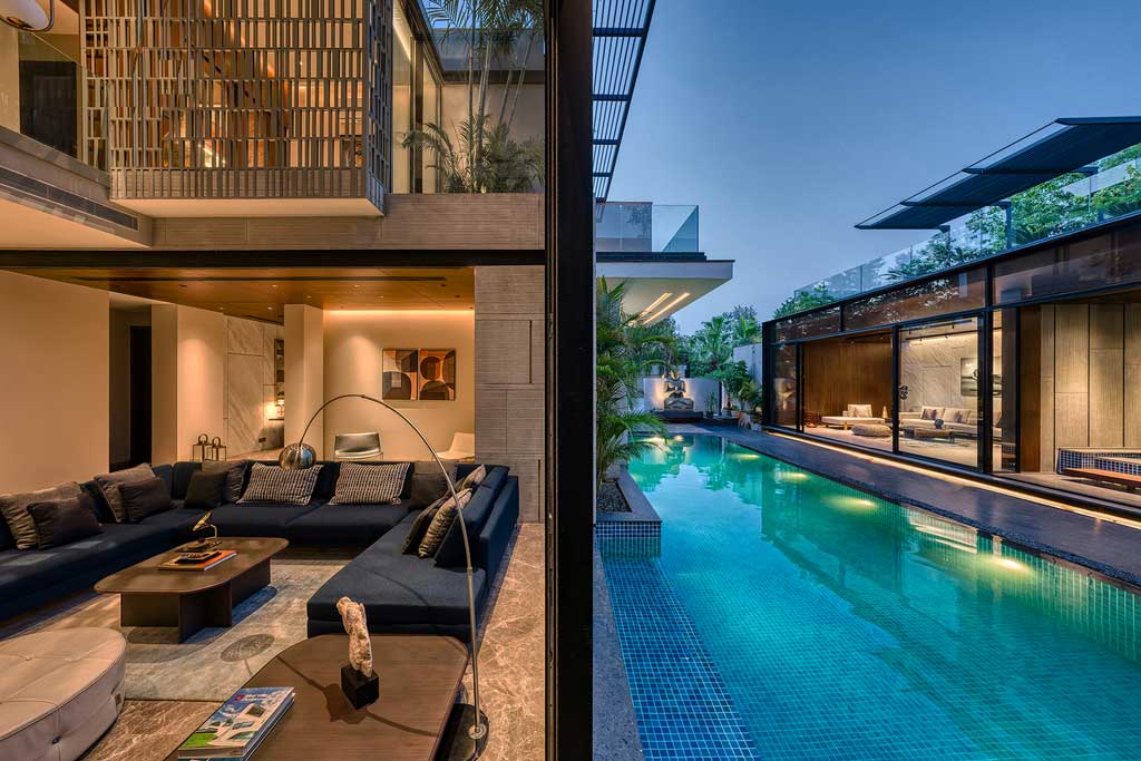 In this space, concrete does not dominate but rather quietly enhances the design’s overall composition. Its smoothness feels like a canvas on which life paints its everyday movements. The material’s neutrality allows other elements of the design, from the rich wooden accents to the shimmering waters of the pool, to stand out. And yet, the beauty of the concrete lies in how it harmonizes everything, bringing unity to the different materials and textures without overwhelming the senses.