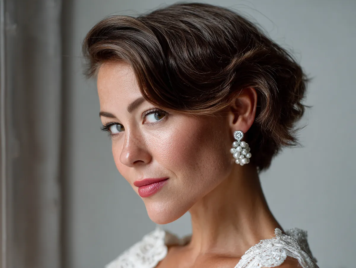 This short hair design for wedding romance adapts effortlessly to indoor or outdoor venues. It looks luminous under chandeliers and glows softly in daylight. The finish remains soft to the touch, achieved with flexible sprays that preserve definition without stiffness. A delicate comb or jeweled pin can accent one side, creating asymmetry reminiscent of 1930s glamour photography.