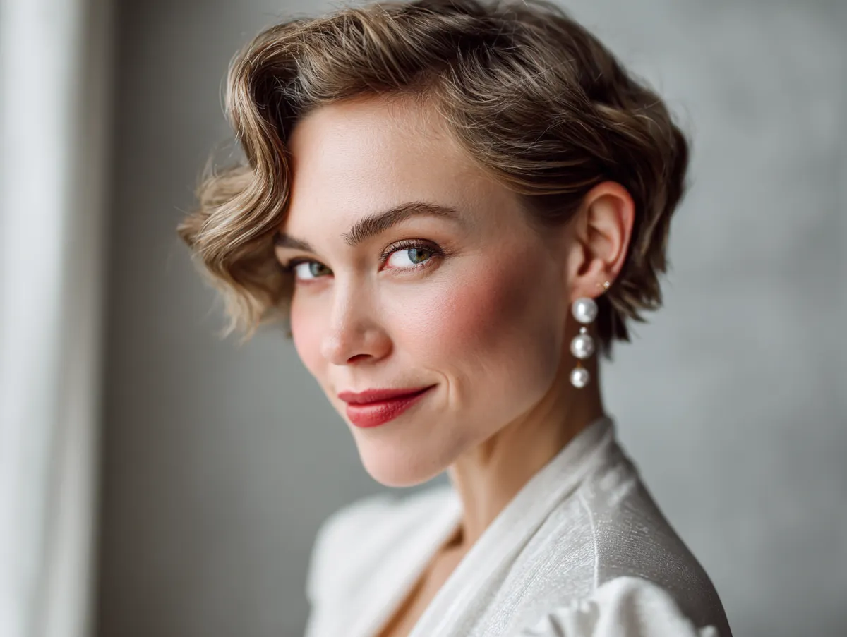 Elegance begins with movement — and few things evoke glamour like polished waves that frame the face with fluid rhythm. This interpretation of a short hair design for wedding celebrations revives the art of sculpted curls once favored by screen legends. Each strand becomes part of a seamless wave pattern that catches the light and moves like satin. The key to achieving this refined texture lies in technique and finish. Stylists rely on a deep side part and pin curls that, once brushed out, form those unmistakable S-shaped curves.