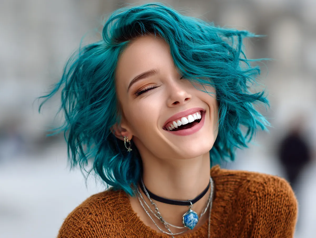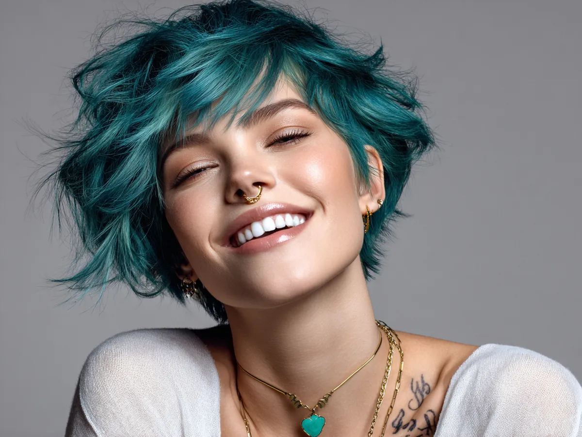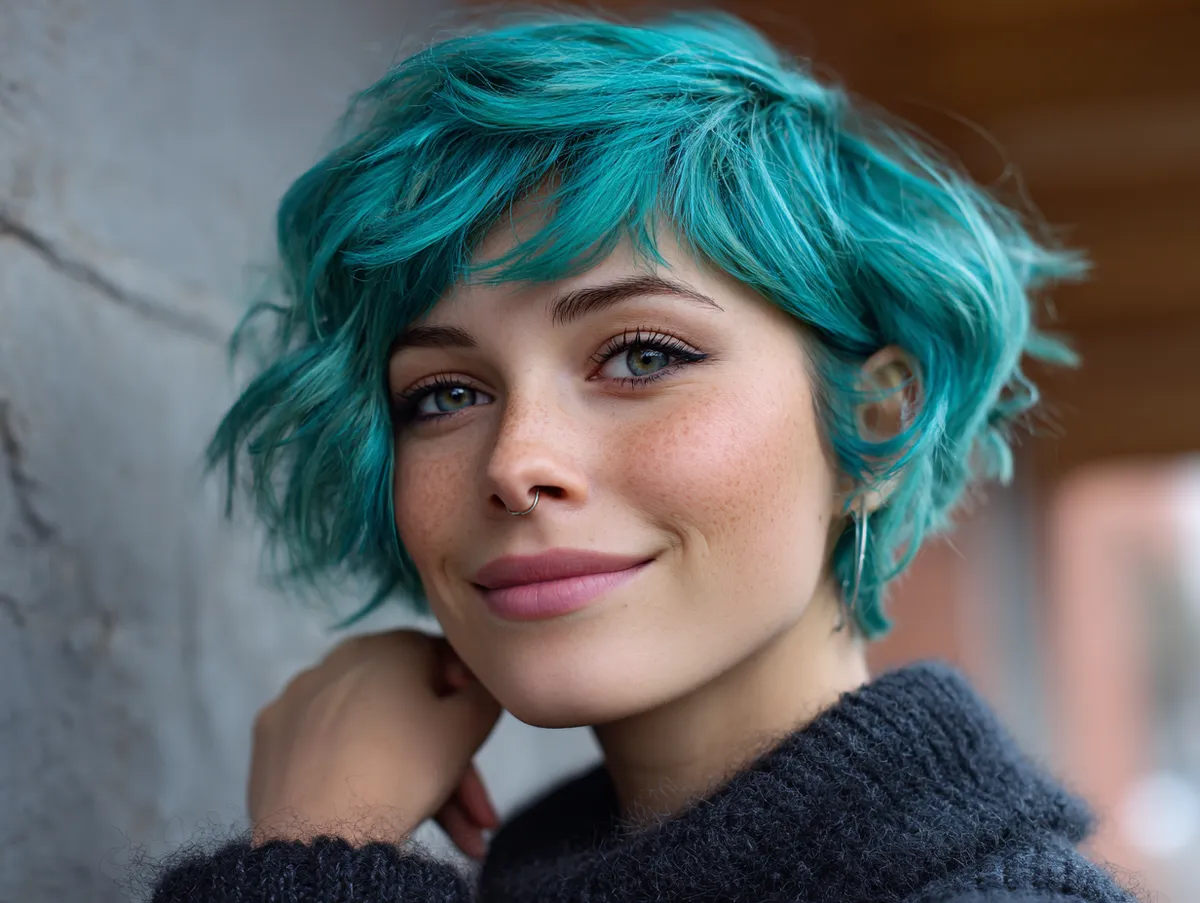 To style this cut, use a lightweight texturizing spray and finger-dry for a relaxed finish. The resulting movement suggests vitality and spontaneity — two qualities that instantly elevate appearance. Add a touch of shine serum to highlight the teal’s brilliance. This hairstyle celebrates the idea that beauty lies in dynamic balance, not rigid symmetry. The layered crop offers both freedom and structure, making it perfect for those seeking a refined yet youthful update. Its versatility proves that creative color and short length can redefine facial harmony and express individuality without compromise.
