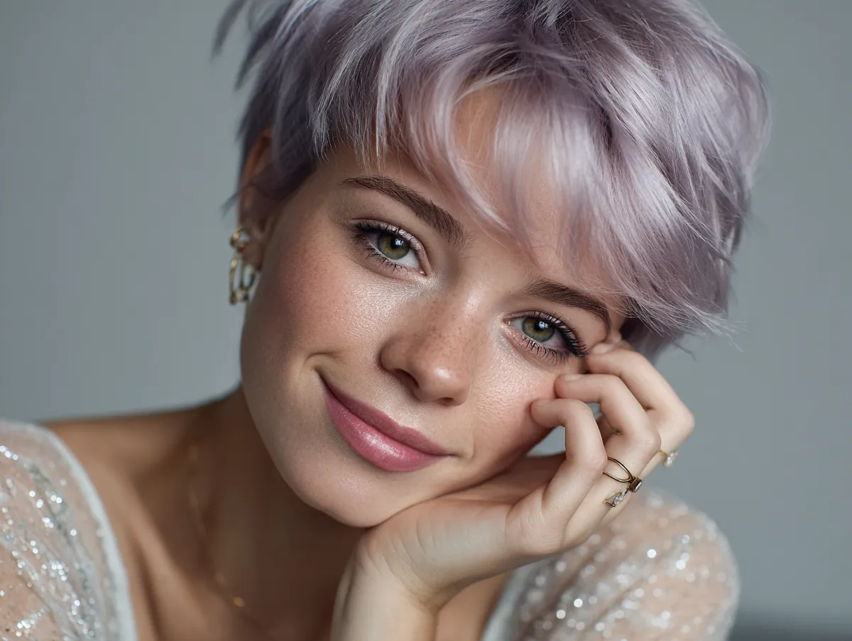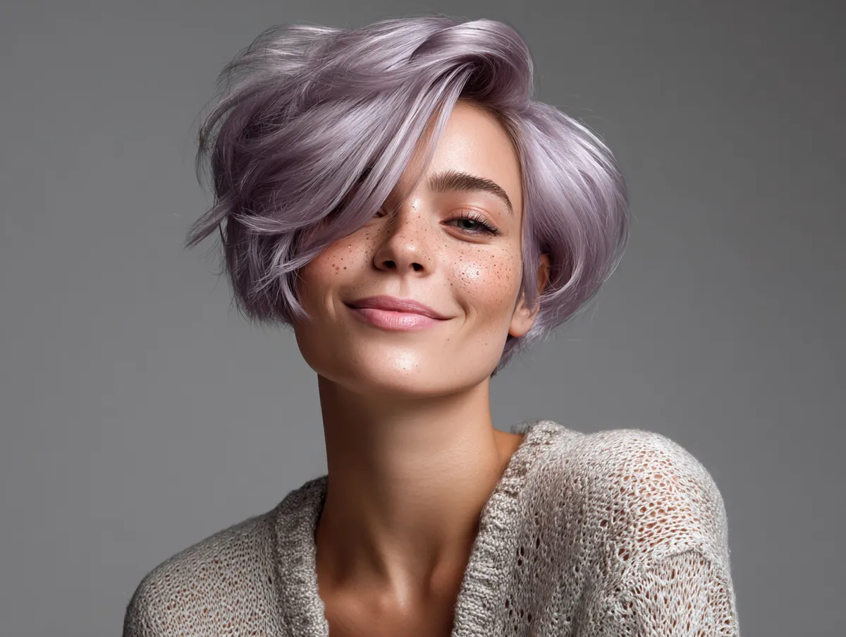 Lavender hair color naturally reflects light, which makes this short hairstyle appear soft and almost weightless. When combined with feathered ends, it creates dimension without bulk. The hairstylist should focus on volume distribution at the top and back of the head — this extra height counterbalances the roundness typical of a fuller face. The delicate lavender hue enhances the airy sensation, helping the overall shape appear lifted rather than wide.
