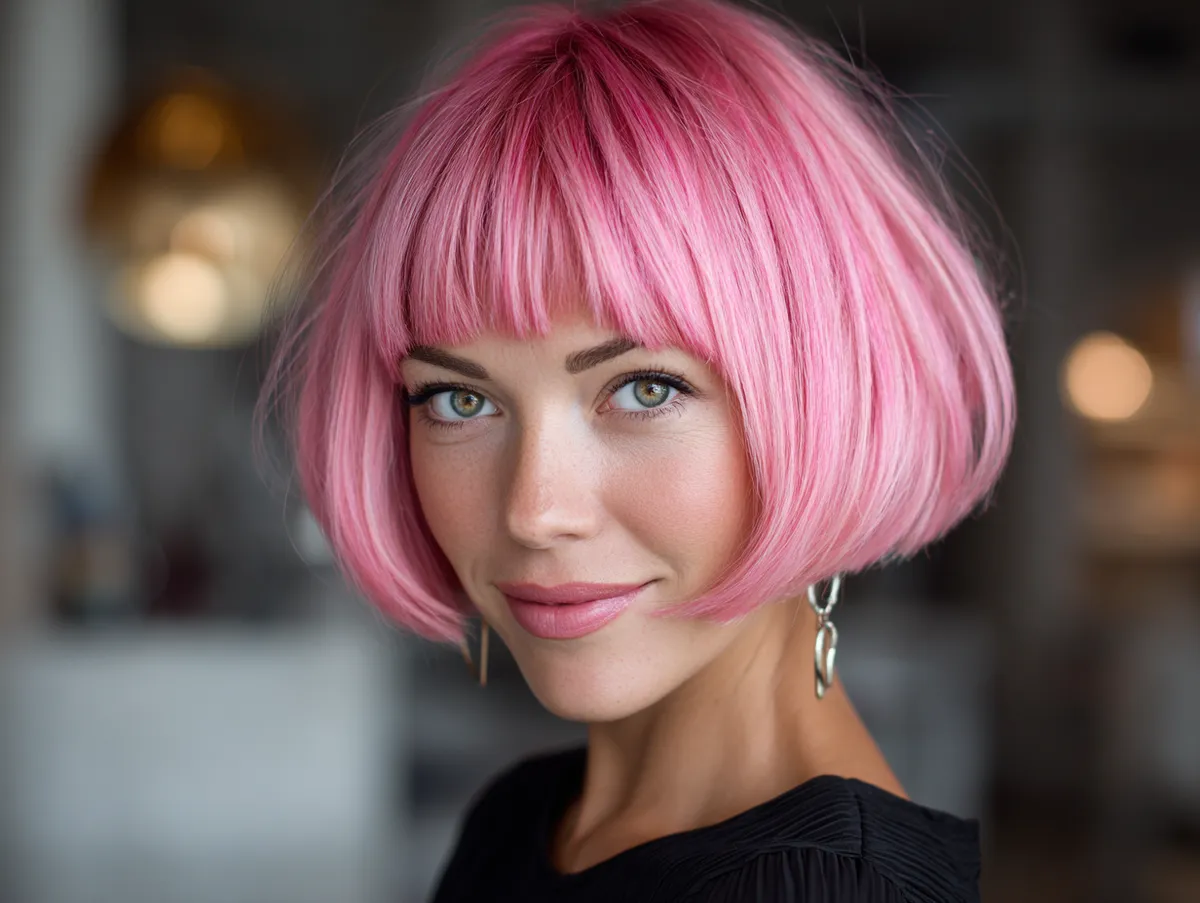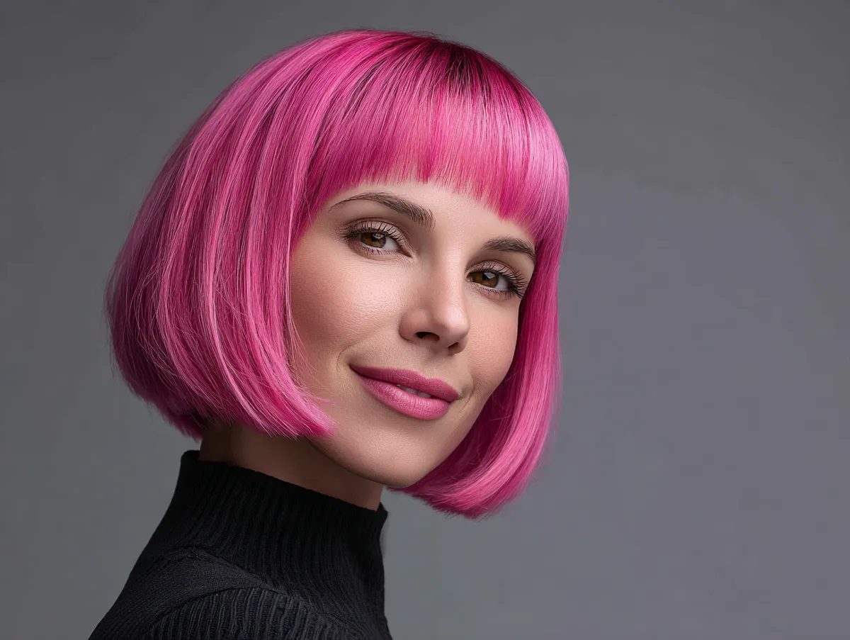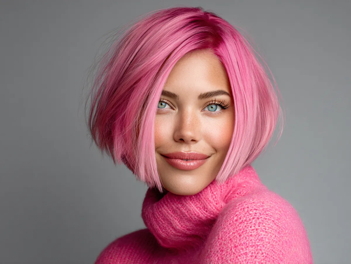 The classic bob remains one of the most versatile choices in hair design. Its structure naturally frames the face while allowing infinite creative variations. For someone with a full facial shape, precision and placement are everything. The key to balance lies in how the bob interacts with cheekbones and jawline. By slightly curving inward below the chin, the hairstyle creates the illusion of a sleeker profile. Electric pink, vivid yet sophisticated, introduces a sense of fun and individuality while shifting visual focus upward to the radiant color and lively movement.