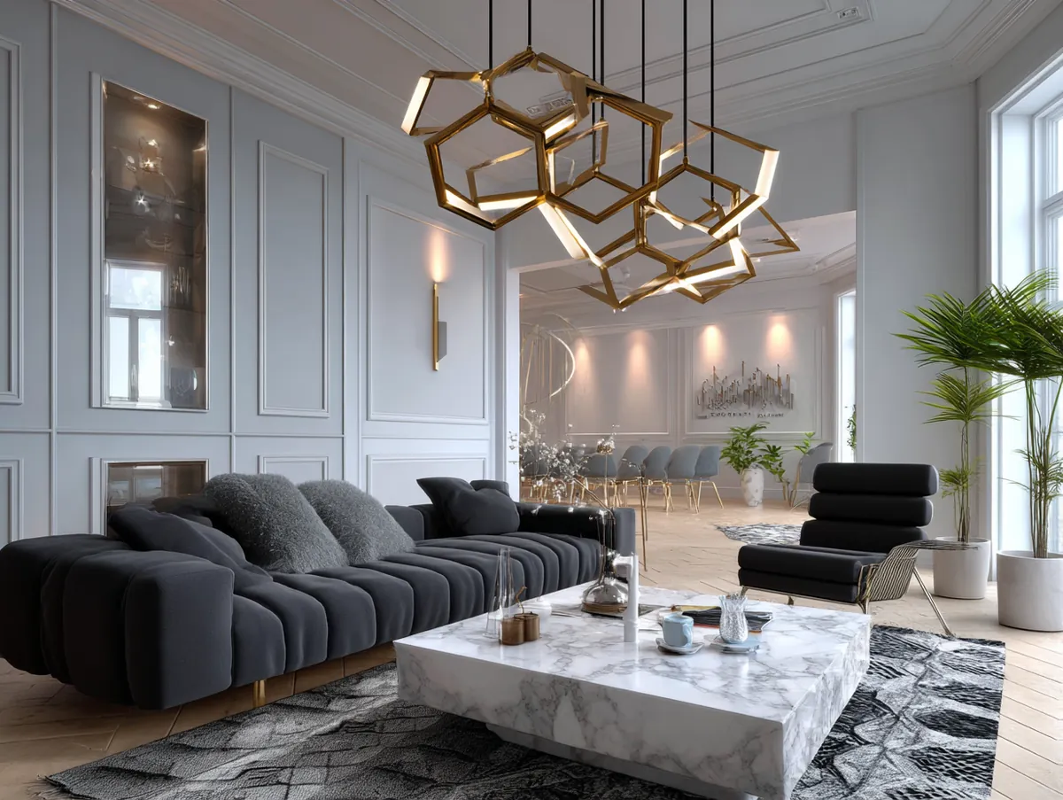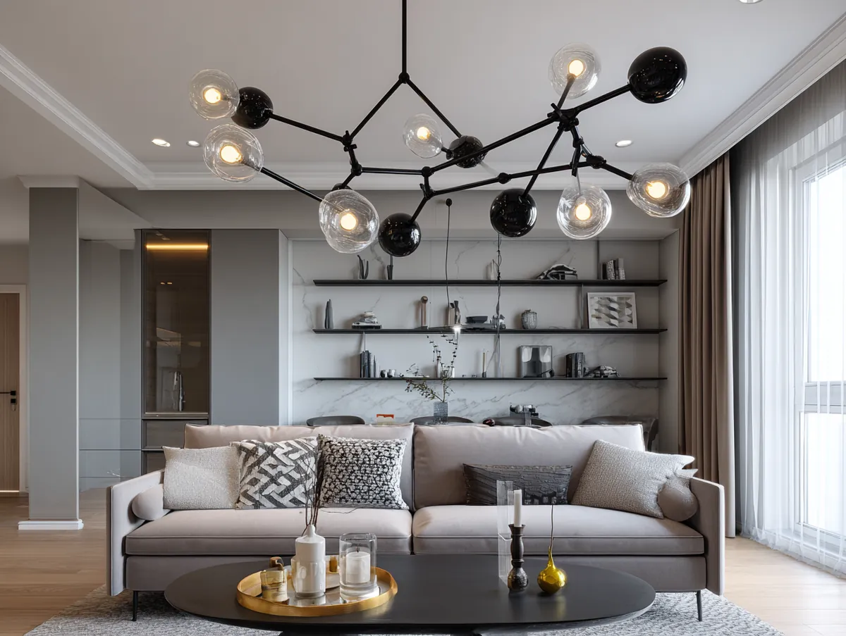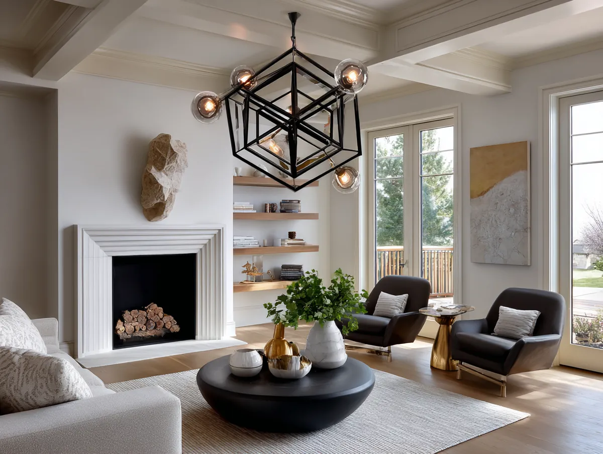 This exquisite photograph portrays more than just a living room adorned with a black geometric chandelier. It represents a design philosophy that embraces contrast and diversity, demonstrating how a statement piece can transform a room into a beautiful, thought-provoking space.
