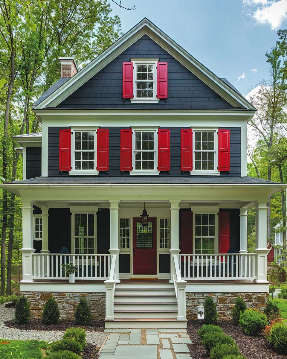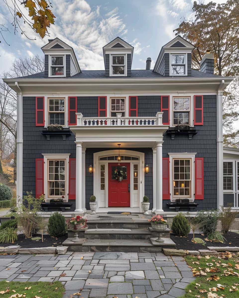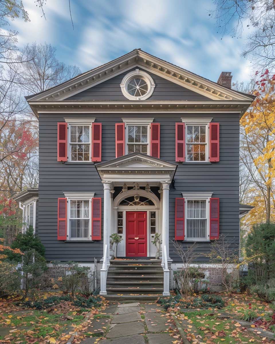 By adopting charcoal gray and intense red as the exterior palette for a Colonial Revival home, homeowners can achieve a balance of time-honored aesthetics and modern flair. This combination challenges conventional boundaries and encourages a broader appreciation for the versatility and adaptability of historic architectural styles. It stands as a testament to the power of color in redefining spaces, inviting us to view traditional designs through a lens of contemporary vibrancy and creativity.