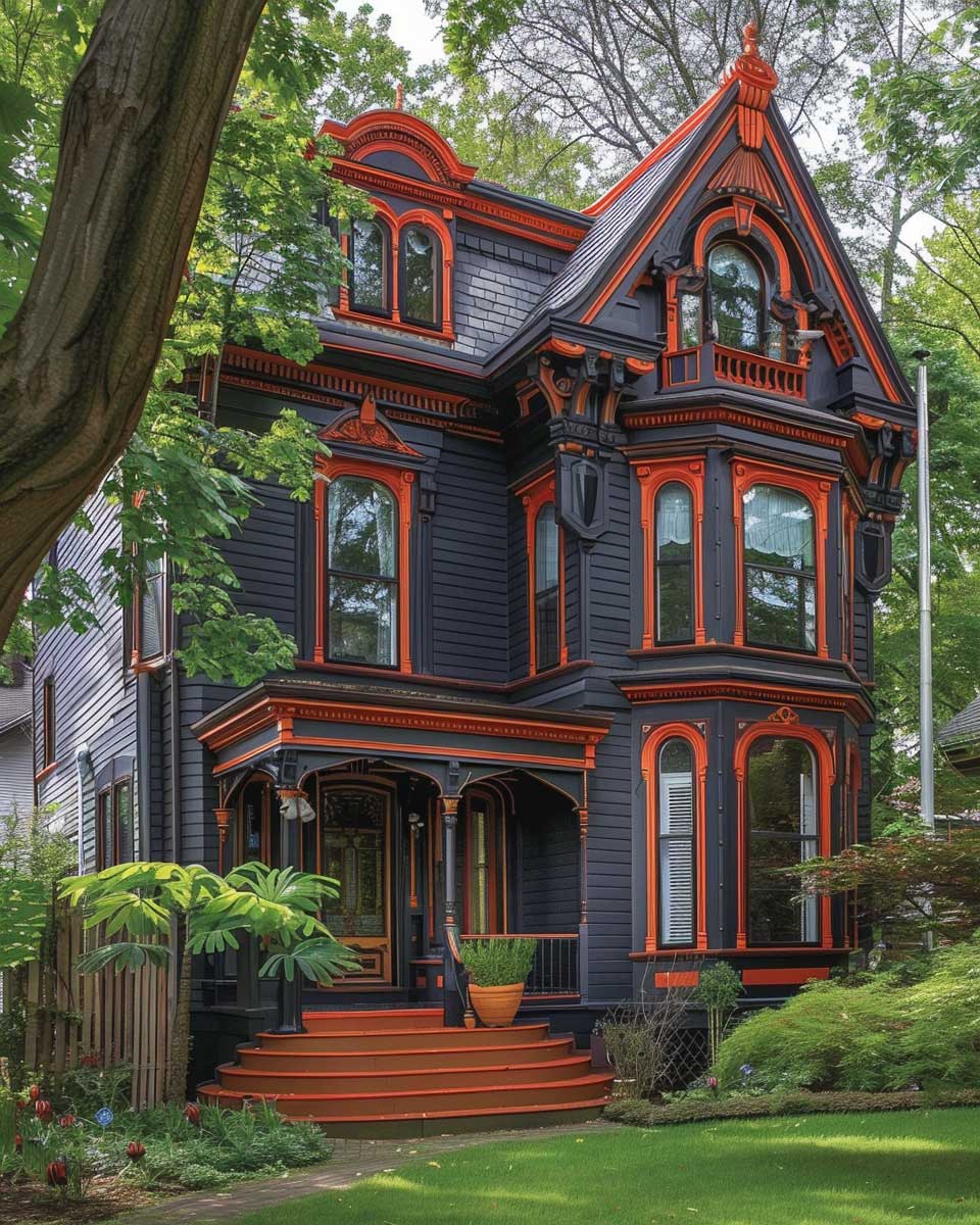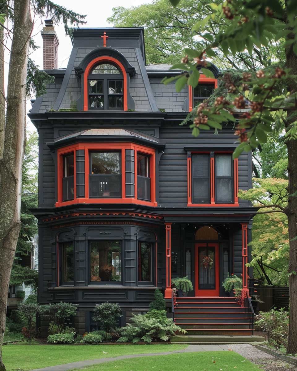 Victorian architecture, known for its intricate details, decorative trim, and ornate facades, provides a perfect canvas for this dynamic color duo. Charcoal gray, with its deep, resonant hue, offers a sophisticated and timeless base that accentuates the architectural complexity and craftsmanship of the era. The addition of intense red highlights these details further, drawing the eye to the exquisite trim work, the ornamental gables, and the grand entrance that are quintessential features of Victorian homes. This daring choice of outside paint colors not only respects the architectural integrity of the period but also injects a contemporary vitality that is both unexpected and delightful.
