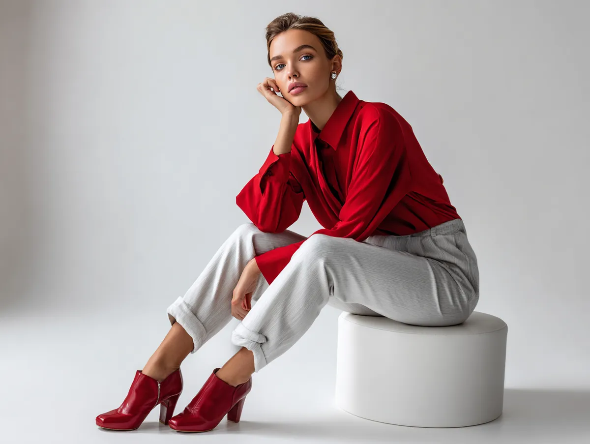 Shades like cobalt blue, fiery red, or citrus yellow instantly create energy in an ensemble. When combined with slim trousers, these colors appear even more intense, thanks to the clean, understated base. Trouser outfit ideas often play with color blocking in this way: pairing a solid bright top with trousers in black, navy, or beige ensures a dynamic but wearable contrast.
