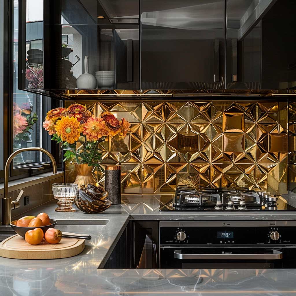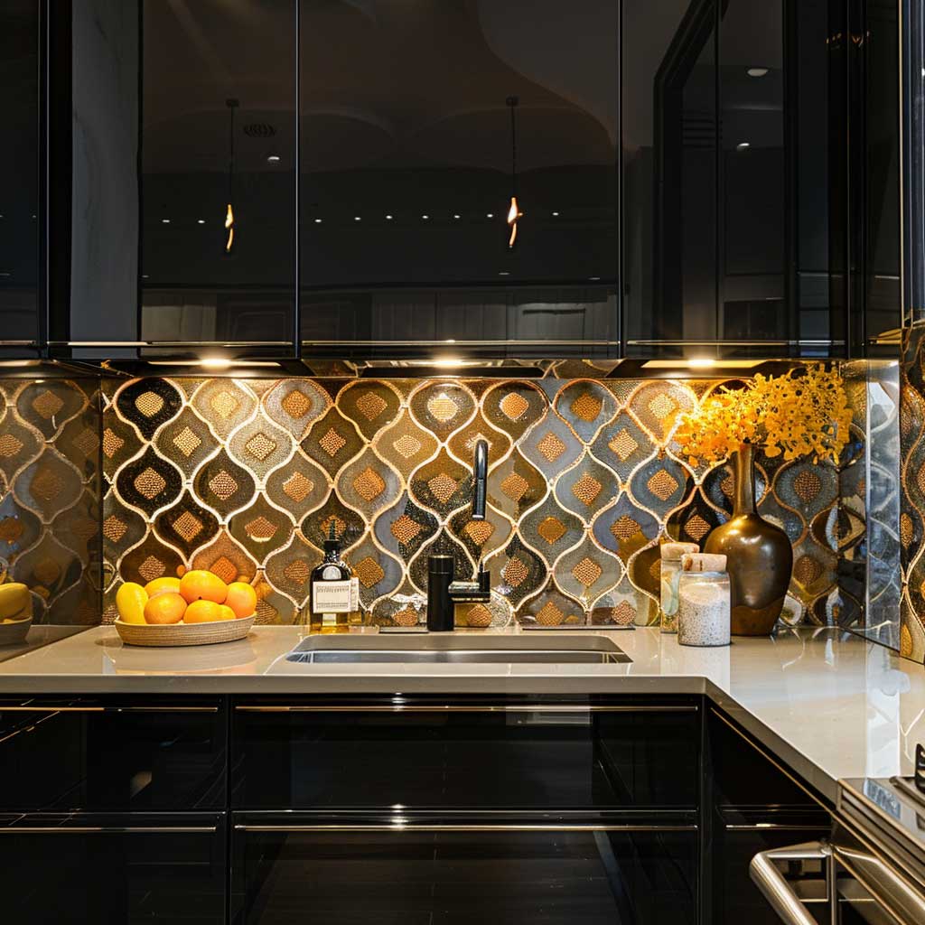 For your backsplash, you could use glass or mirrored tiles. These reflective surfaces will enhance an illusion of the small space in the kitchen, besides adding to the general opulence of the design. Geometric patterns in the backsplash can do well for reinforcing the Art Deco theme, pulling the entire look together.
