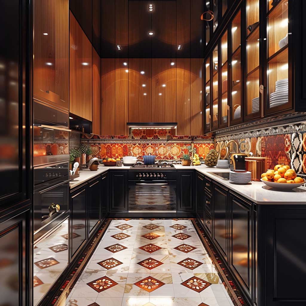 The floor is another place where geometrical patterns can be used. Black and white checkerboard tiles or a carpet with a bold geometrical pattern will add more visual excitement and depth to the kitchen. Besides, these elements give further raison d’etre to the feel of Art Déco and help in defining the space, making it crisper and more organized.