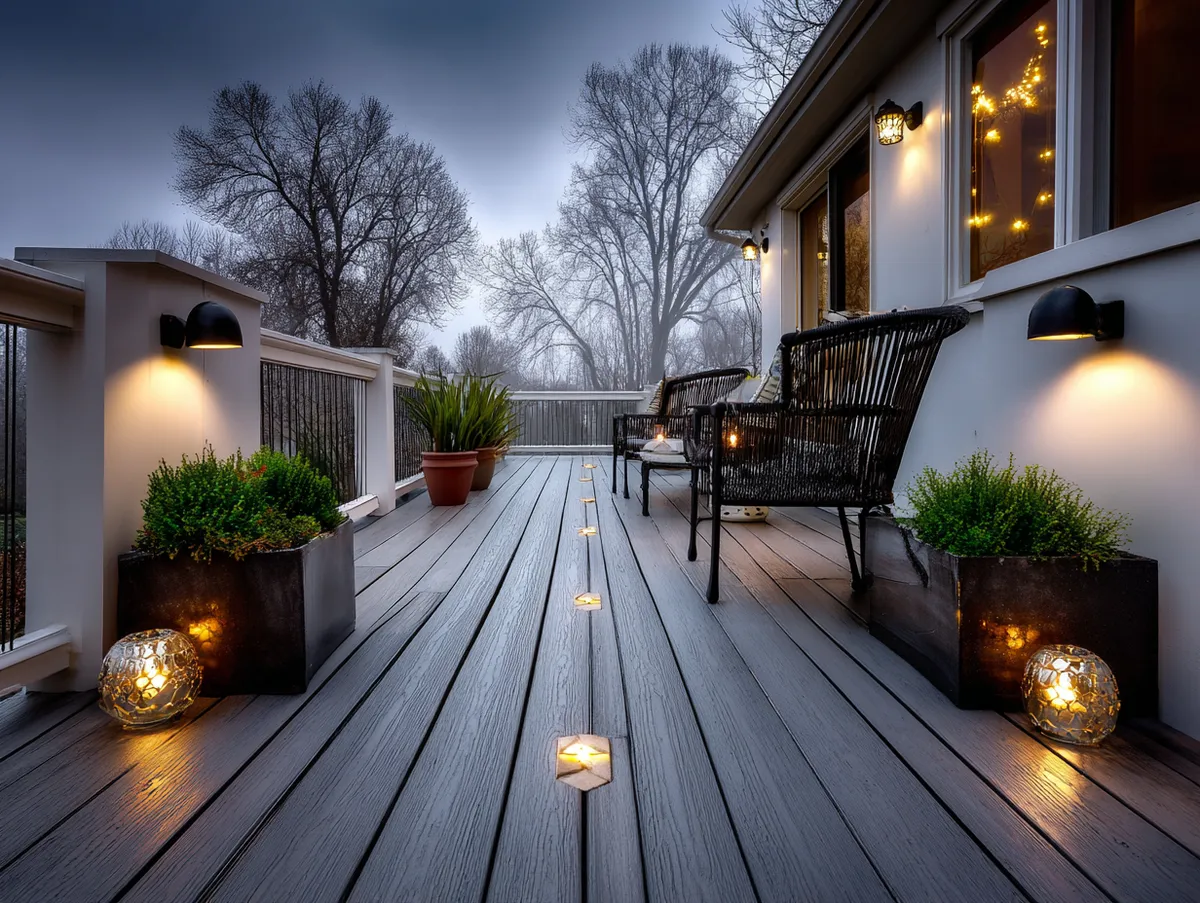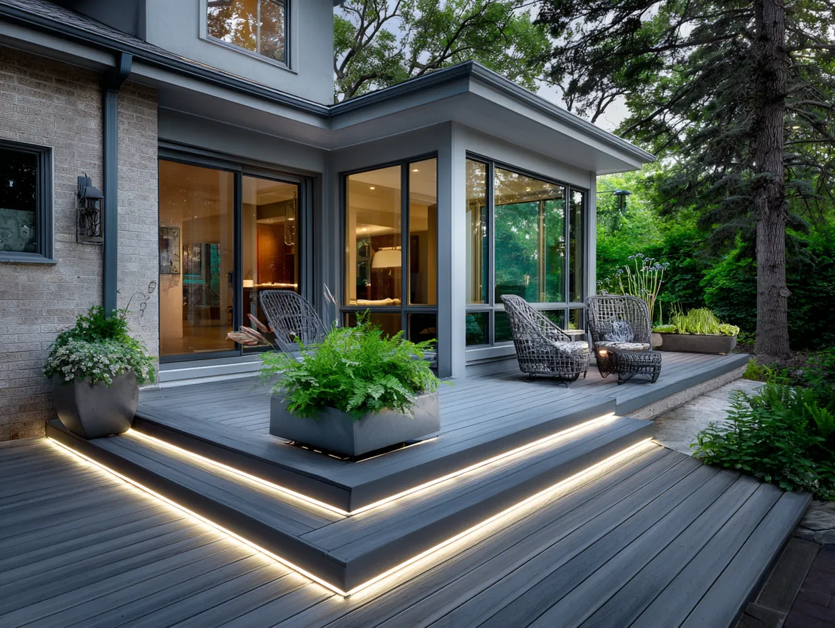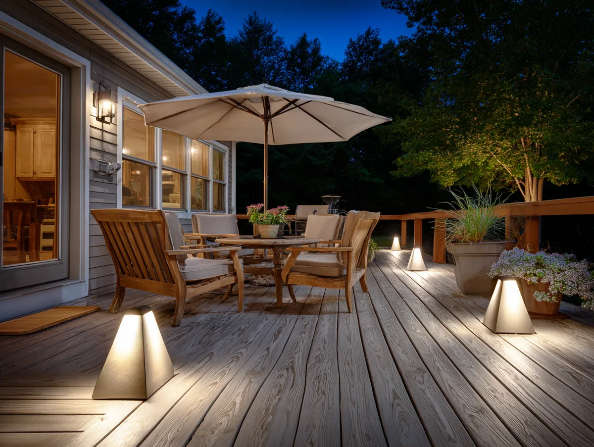 Finally, the image conveys a sense of coziness and tranquility brought on by the warm illumination. It underscores how well-designed deck lighting can transform outdoor spaces into inviting sanctuaries for relaxation, perfect for spending peaceful evenings under the stars.