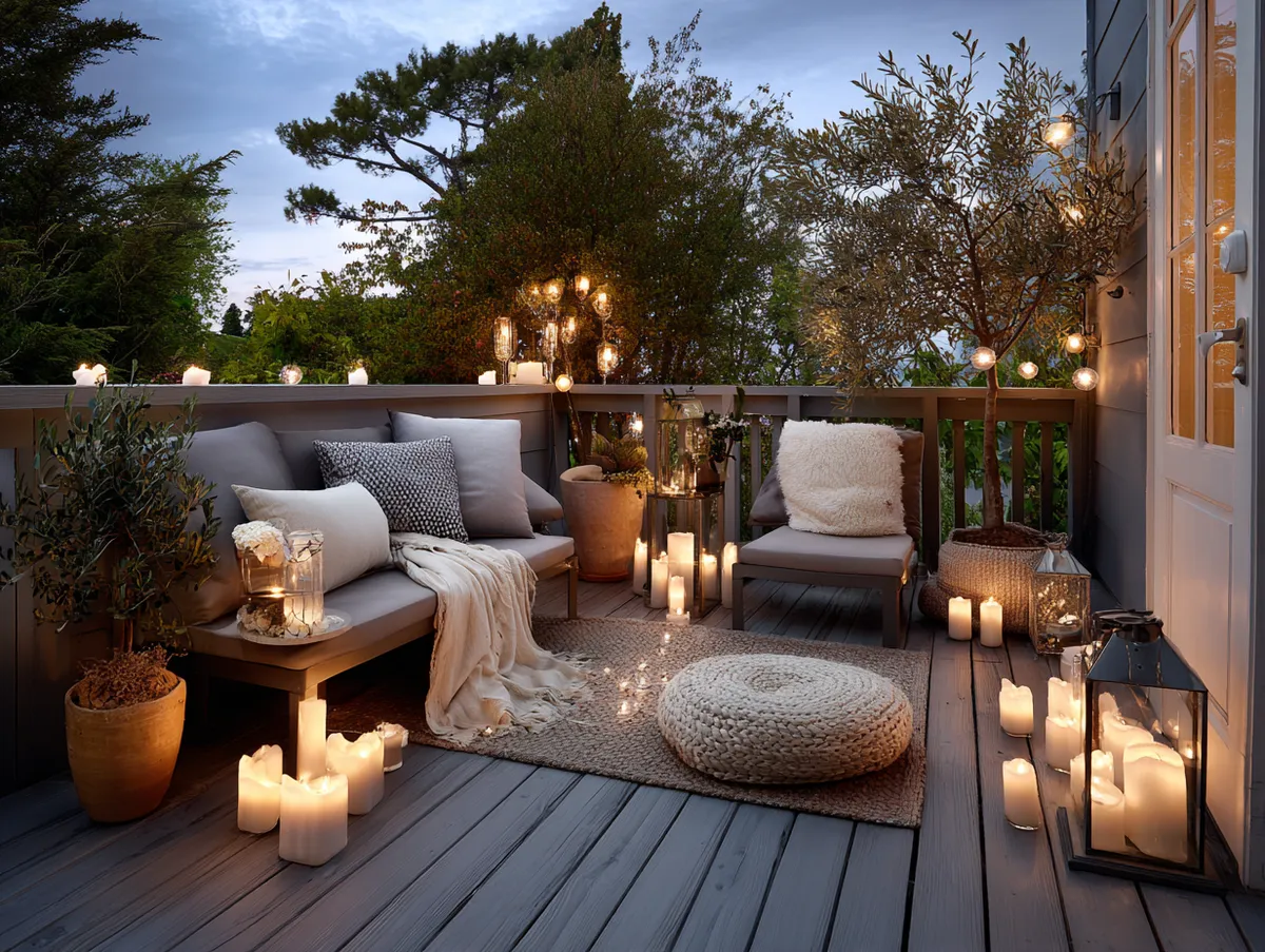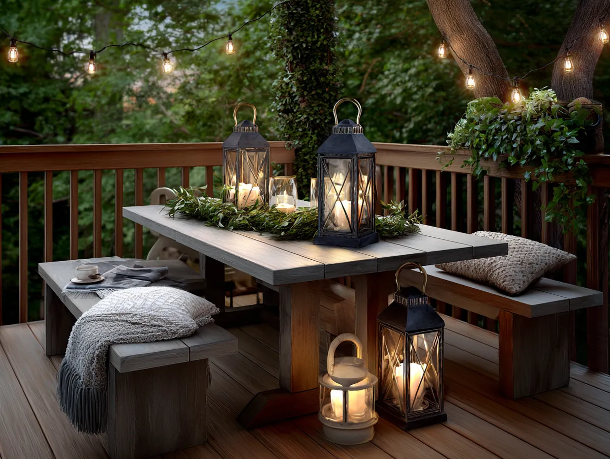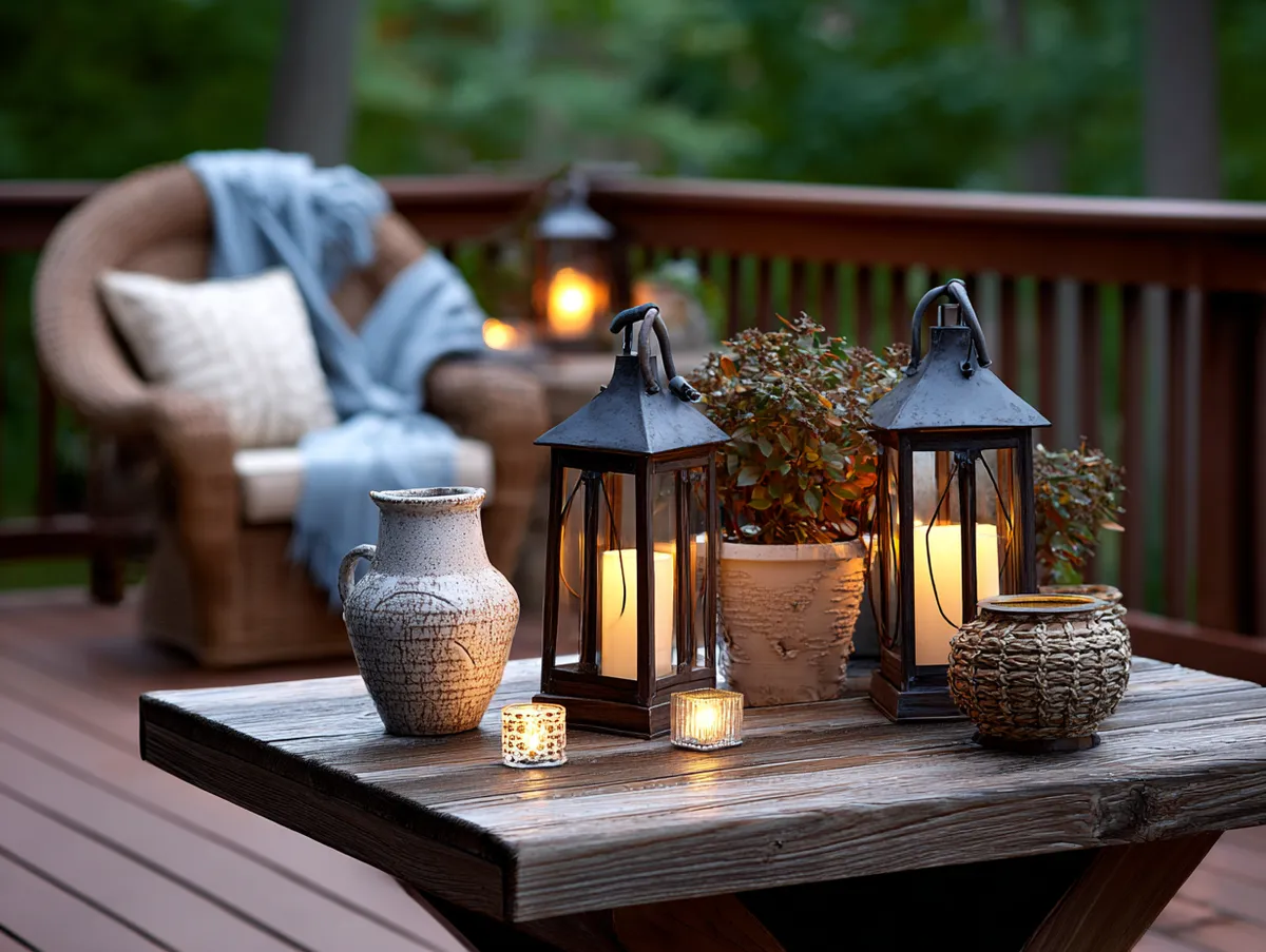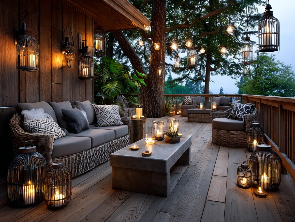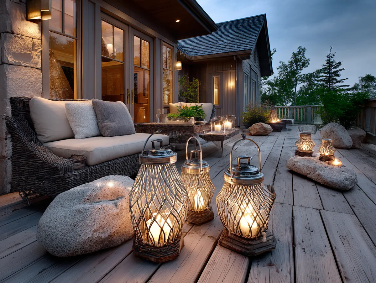 Different types of lighting fixtures are visible in the picture, each contributing to the overall ambiance. From the wall-mounted lanterns to the tabletop candles, these lights offer a gentle, comforting glow that perfectly complements the deck’s rustic aesthetic.