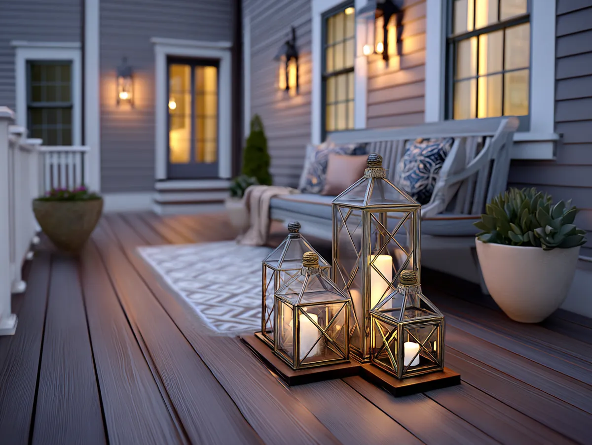 Central to the image is the wooden deck, bathed in a soft, warm light that brings out the wood’s rich texture and natural tones. The lantern-style lights, reminiscent of old-world charm, accentuate the rustic aesthetic of the deck, adding a sense of nostalgia and tranquility to the scene.