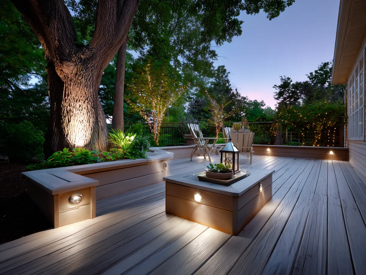 This photograph depicts an outdoor deck transformed into a magical oasis through thoughtful lighting design. The image shows a variety of lighting fixtures strategically placed to highlight the deck’s best features while creating a warm, inviting ambiance. This picture effectively captures the essence of how the right lighting can completely transform an outdoor space, making it more usable and appealing after sunset.
