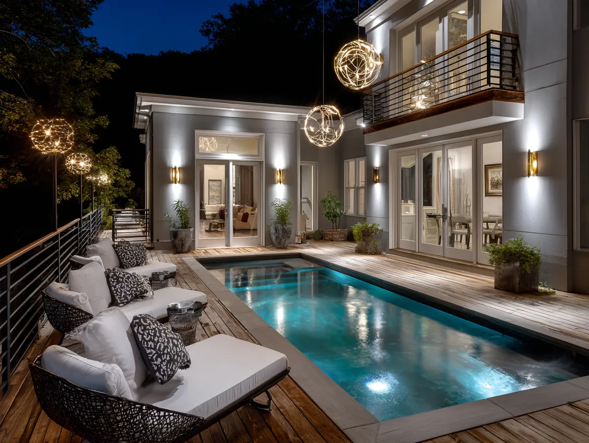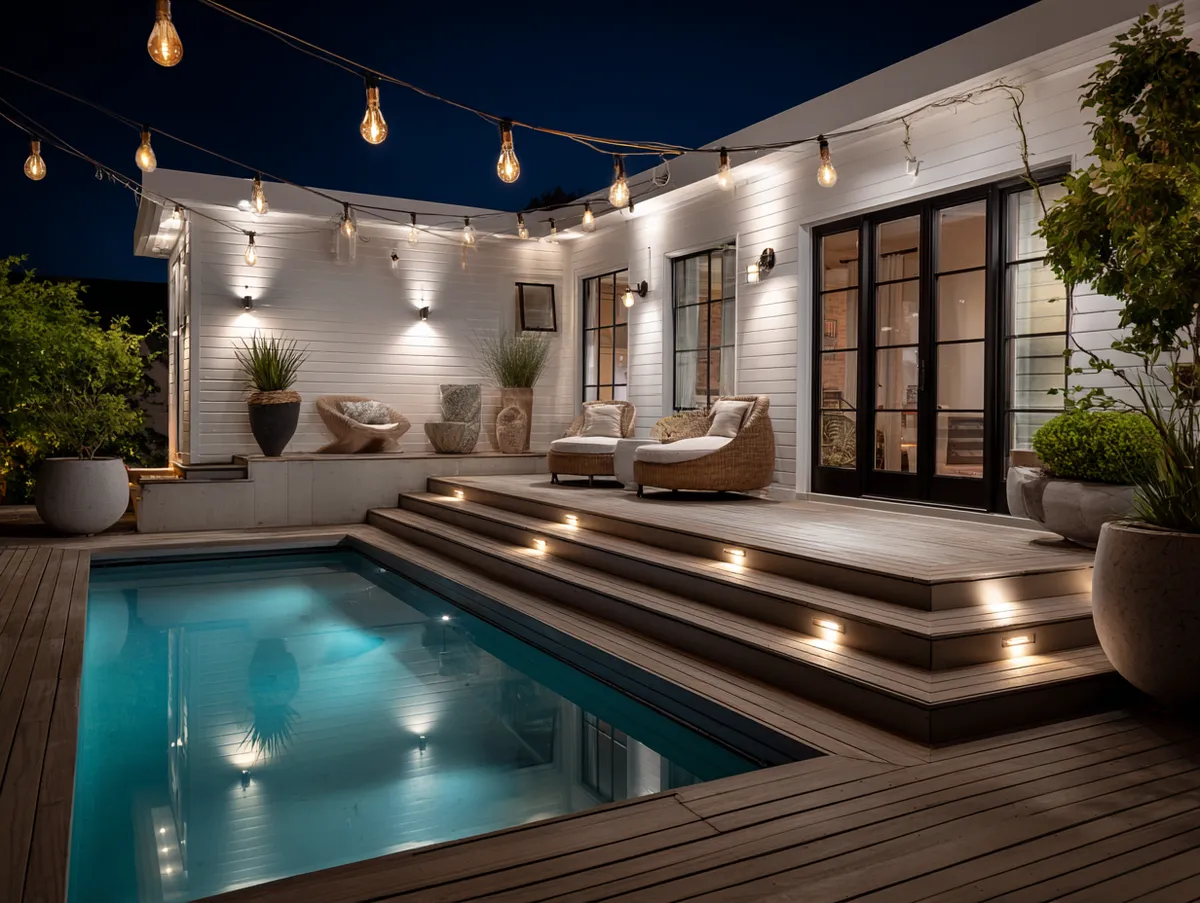Key architectural details of the deck, such as the seating area and steps leading to the pool, are well-illuminated. This not only enhances their aesthetic appeal but also highlights their functionality. It’s a practical consideration for safety, ensuring easy navigation even after the sun has set.