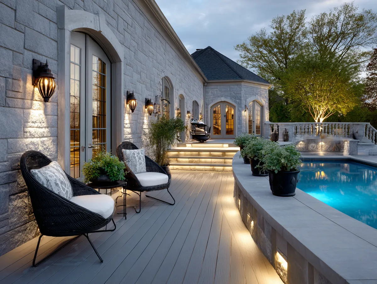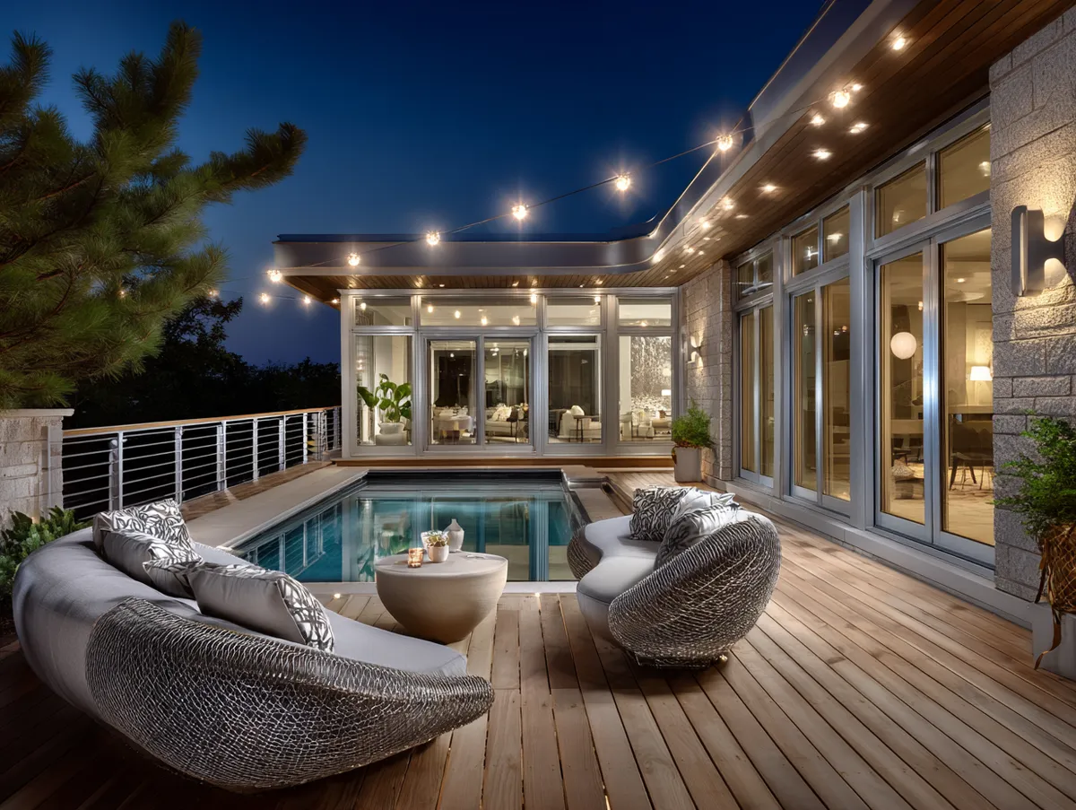 This photo captures the elegance and sophistication of an upscale outdoor deck, enhanced by a tasteful lighting design. The deck, seating area, and adjacent pool are illuminated in a soft glow, creating a picture of opulence and tranquility. The image effectively demonstrates how lighting design can significantly contribute to the overall aesthetic and ambiance of a decked outdoor space.