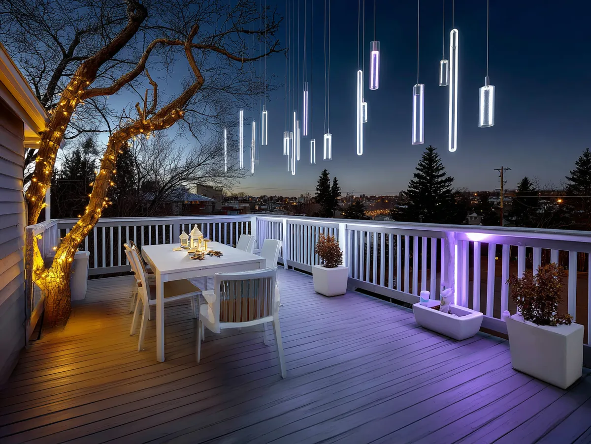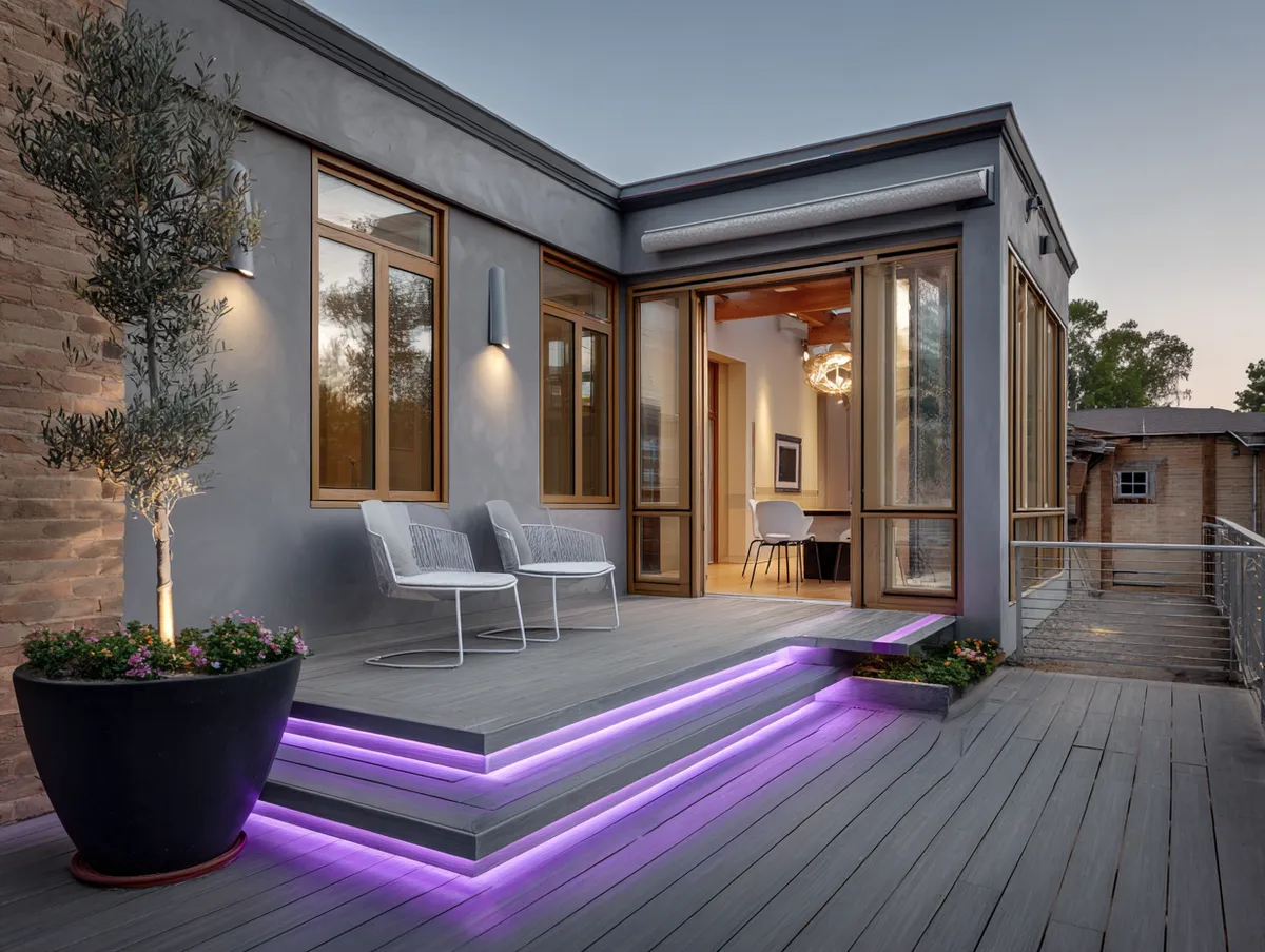 This photograph captures a modern outdoor deck space illuminated by a unique mix of neon and white lights. The deck’s sleek design, coupled with the innovative lighting, creates a vibe that is undeniably contemporary and chic. This image shows how lighting can inject a distinct personality into an outdoor deck space, reflecting modern design sensibilities.
