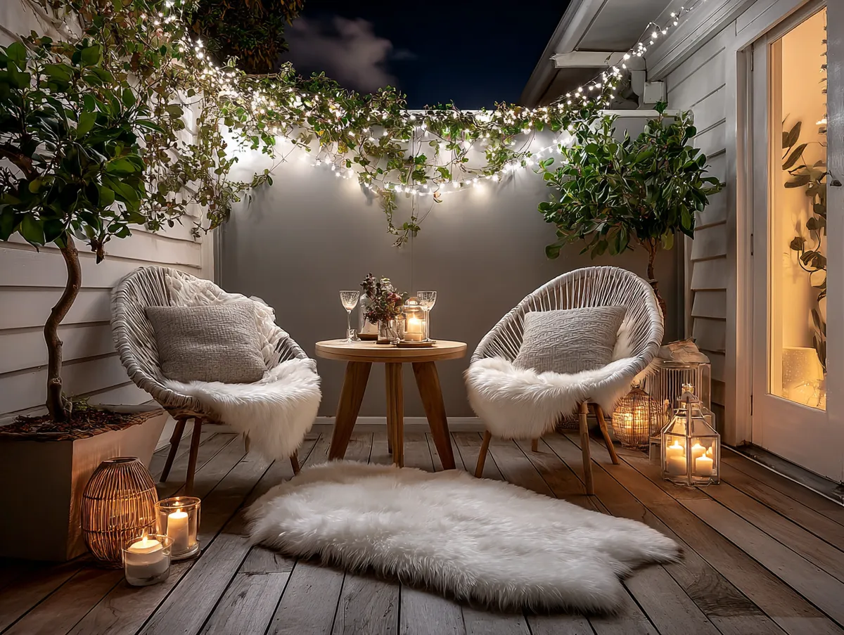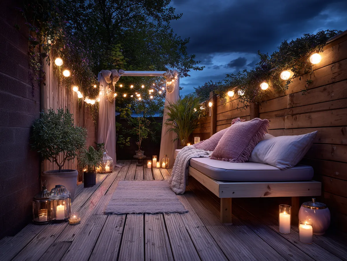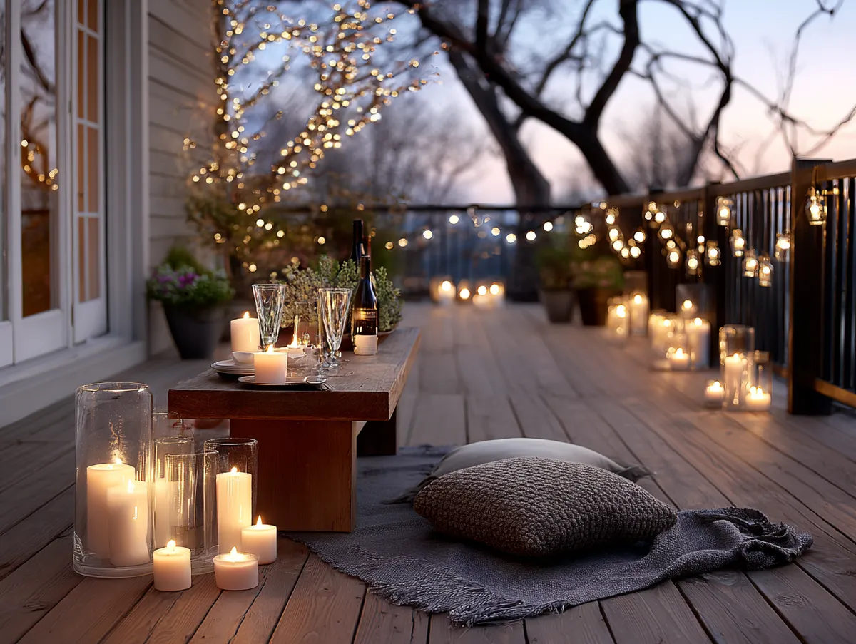 This photograph captures a beautifully lit outdoor deck exuding a distinct romantic vibe. Adorned with fairy lights and candlelight, the deck offers a magical and intimate setting, perfect for a quiet evening or a romantic dinner. The image effectively demonstrates how creative lighting can transform an outdoor deck into a unique and personal sanctuary.