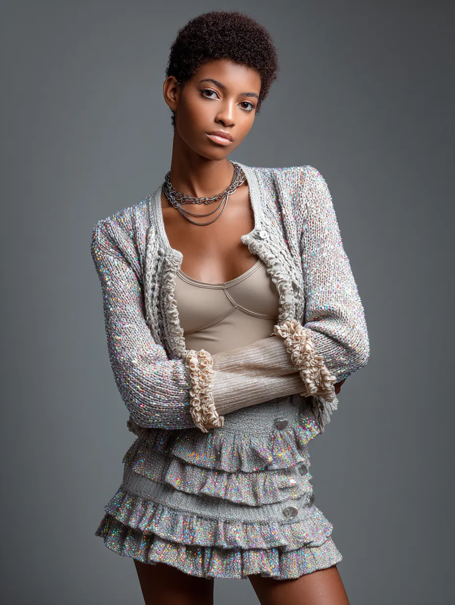 Lighting plays a significant role in showcasing this pairing. Soft, diffused light ensures the sparkle of the cardigan appears gentle and radiant. It also highlights the lines of the pleats without introducing harsh shadows. A clean background allows the textures to stand out, reinforcing the minimalistic elegance often present in editorials influenced by 90s fashion ideas. This photographic style enhances clarity and brings focus to the composition.