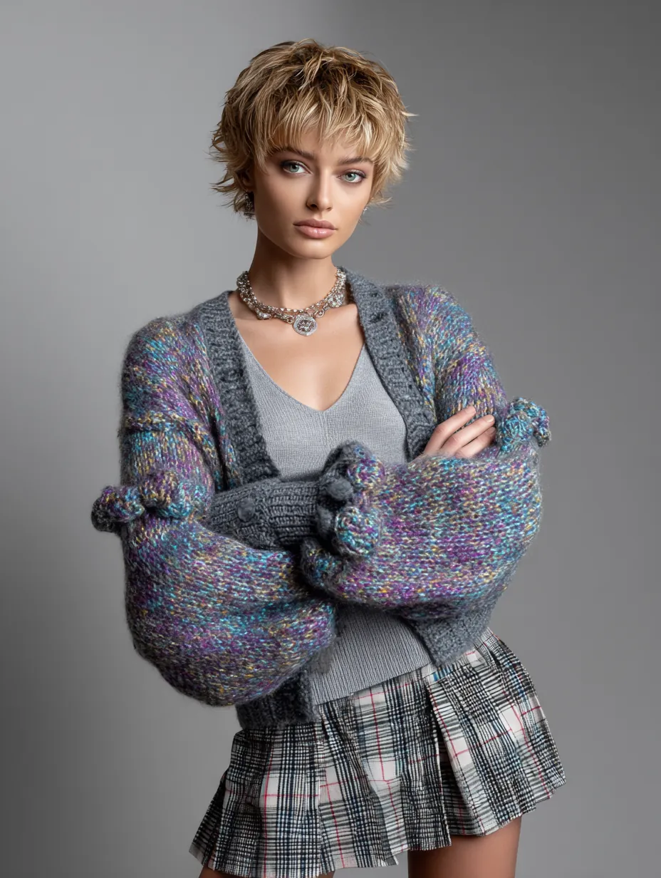 A soft sparkle cardigan paired with a pleated mini kilt brings warmth, dimension, and nostalgic charm into a cohesive and expressive outfit. This combination creates balance through the interplay of gentle shine, structured lines, and flowing movement. The softness of the cardigan complements the firmness of the pleats, resulting in a visually pleasing harmony that reflects the creative direction associated with 90s fashion ideas. This look uses contrast to its advantage while still projecting ease and confidence.