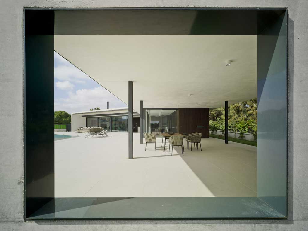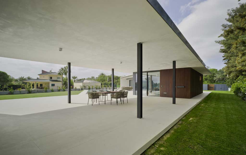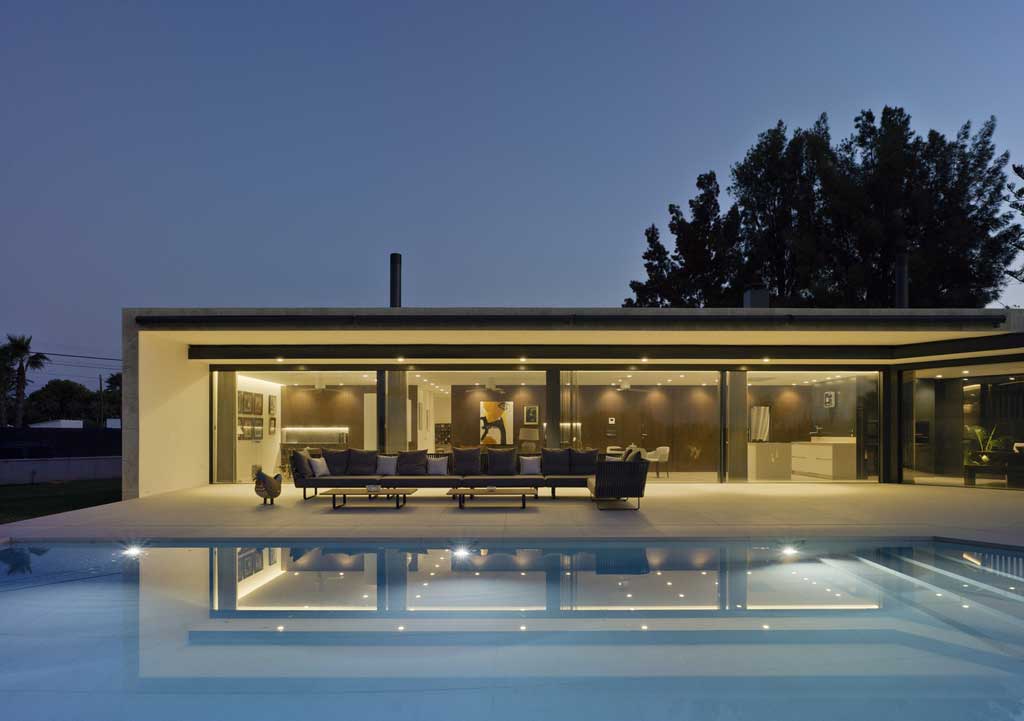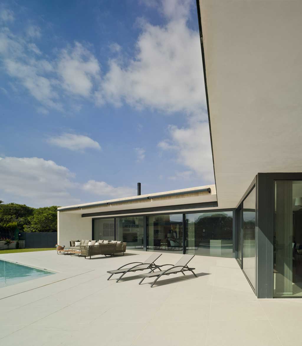 Water plays a significant role in the residence’s design. The swimming pool, reflecting the sky above, creates a sense of continuity, making it seem as if the house, the pool, and the sky are all parts of a singular entity.