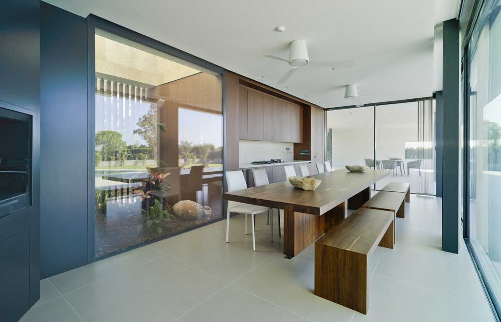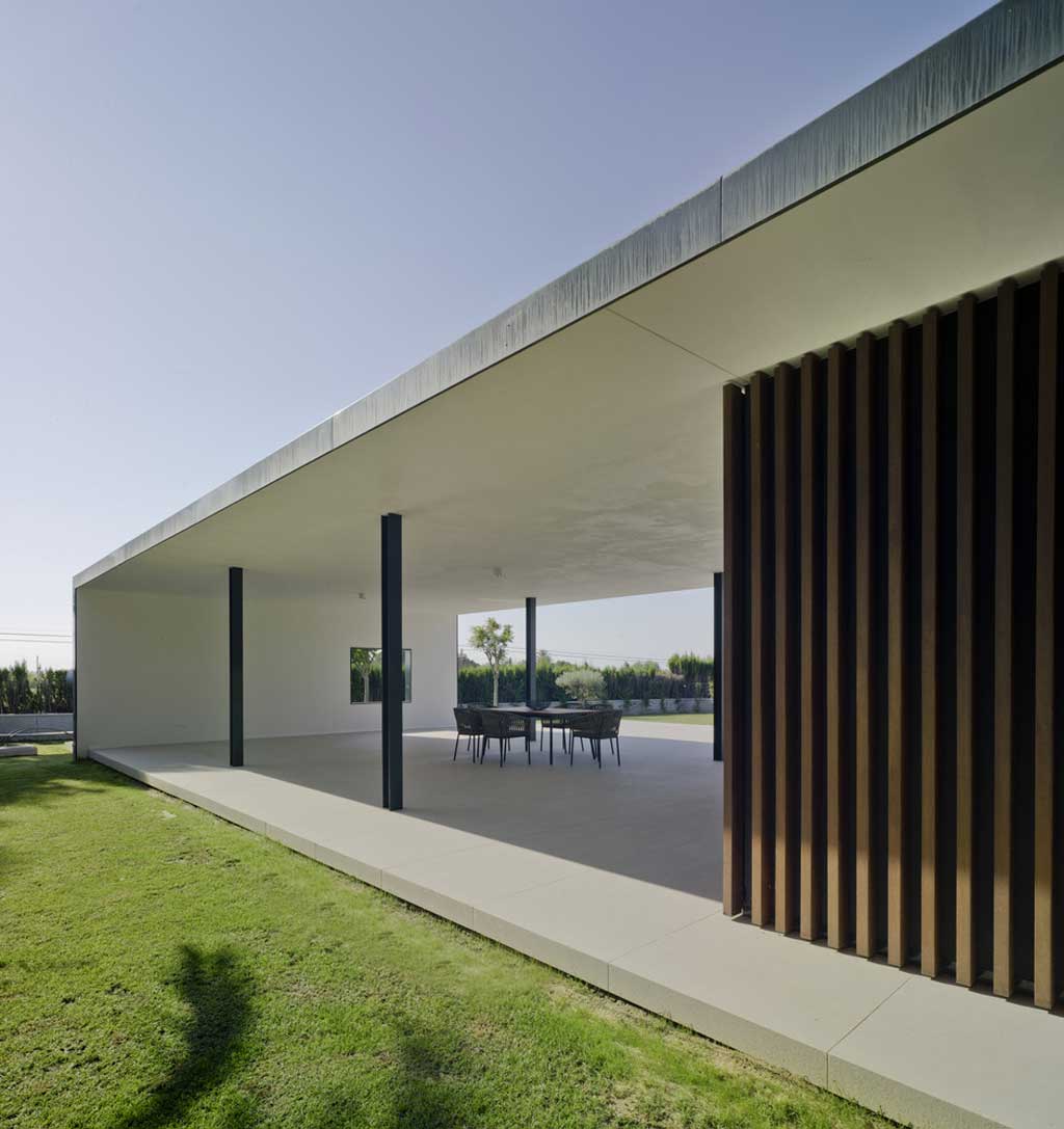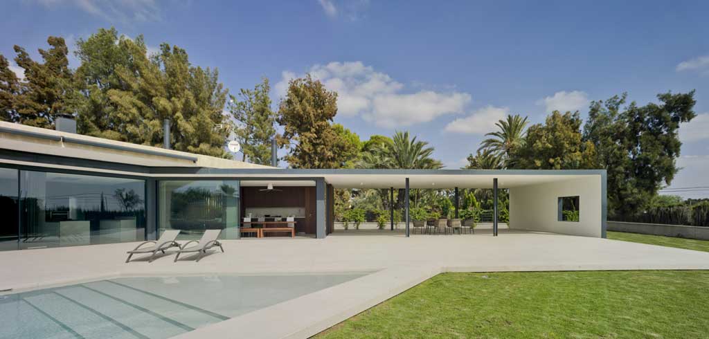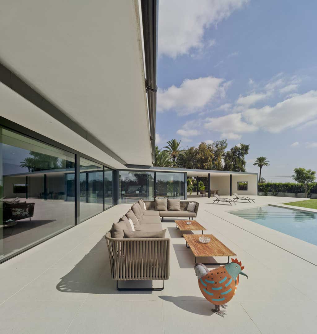 Water plays a significant role in the residence’s design. The swimming pool, reflecting the sky above, creates a sense of continuity, making it seem as if the house, the pool, and the sky are all parts of a singular entity.